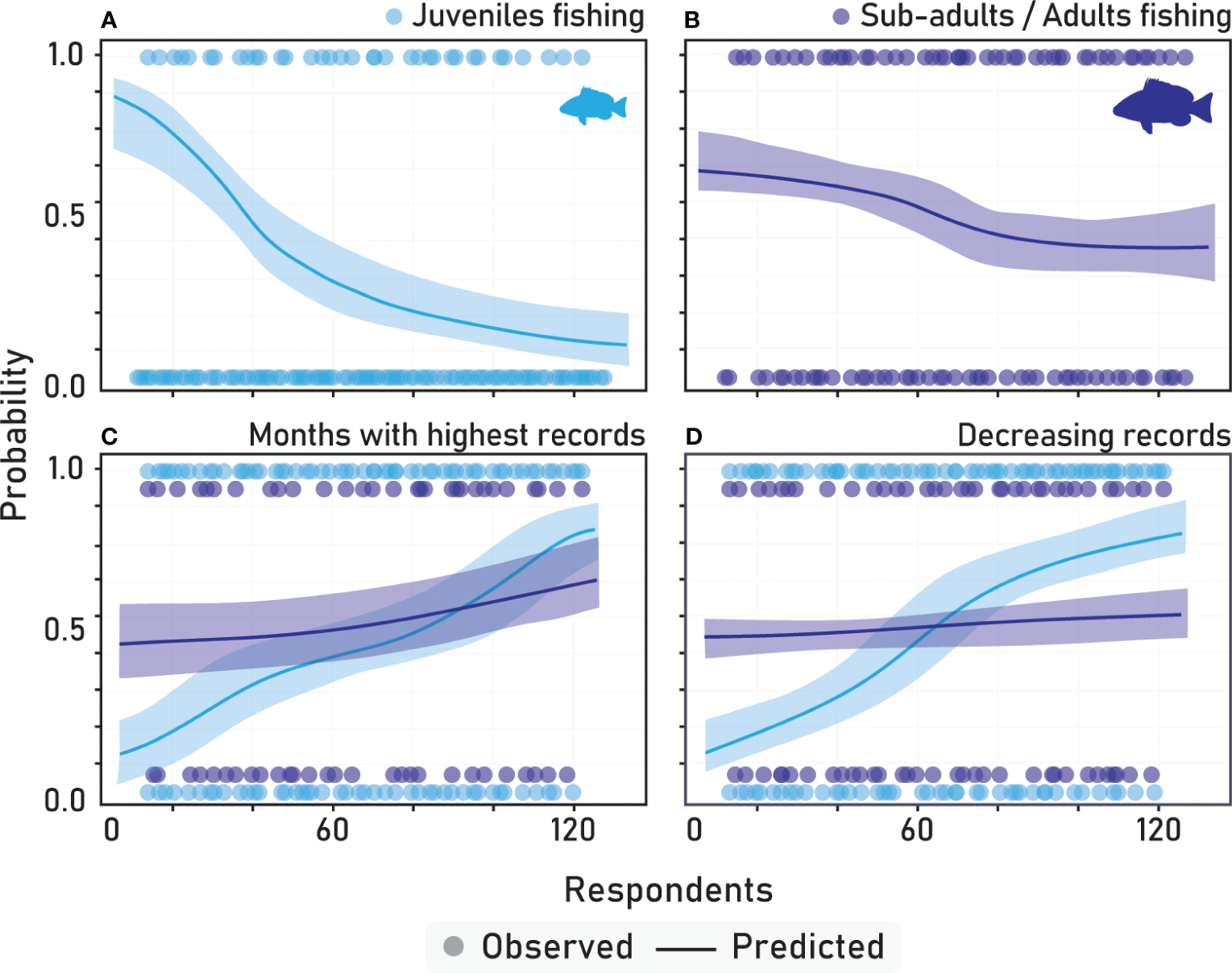 Logistic Regression representations regard answers of fishers on fishing of juveniles (A), sub-adults/adults (B), months for highest records (C), and decreasing records (D) of the cubera snapper. The slope of the binary logistic regression line indicates the predicted probability of fishing cubera snapper taking into account the number of fishers interviewed in all estuarine systems.