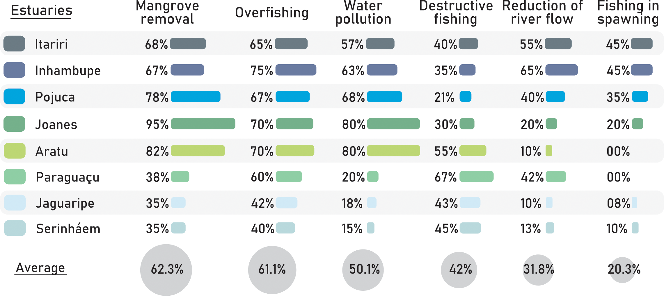 Fishers identified several major threats to cubera snapper juveniles in estuarine systems. The primary reasons cited included mangrove removal (62.3%), overfishing (61.1%), water pollution resulting from urban and industrial waste (50.1%), destructive fishing practices (42%), reduction of river flow (31.8%), and fishing during spawning periods (20.3%) (Figure 5). The specific threats reported varied across estuaries, influenced by their conservation status and coastal development pressure. Notably, there were significant differences (p< 0.01; Table 3) in the proportion of each threat mentioned during the interviews among fishers from different estuaries (Figure 5).