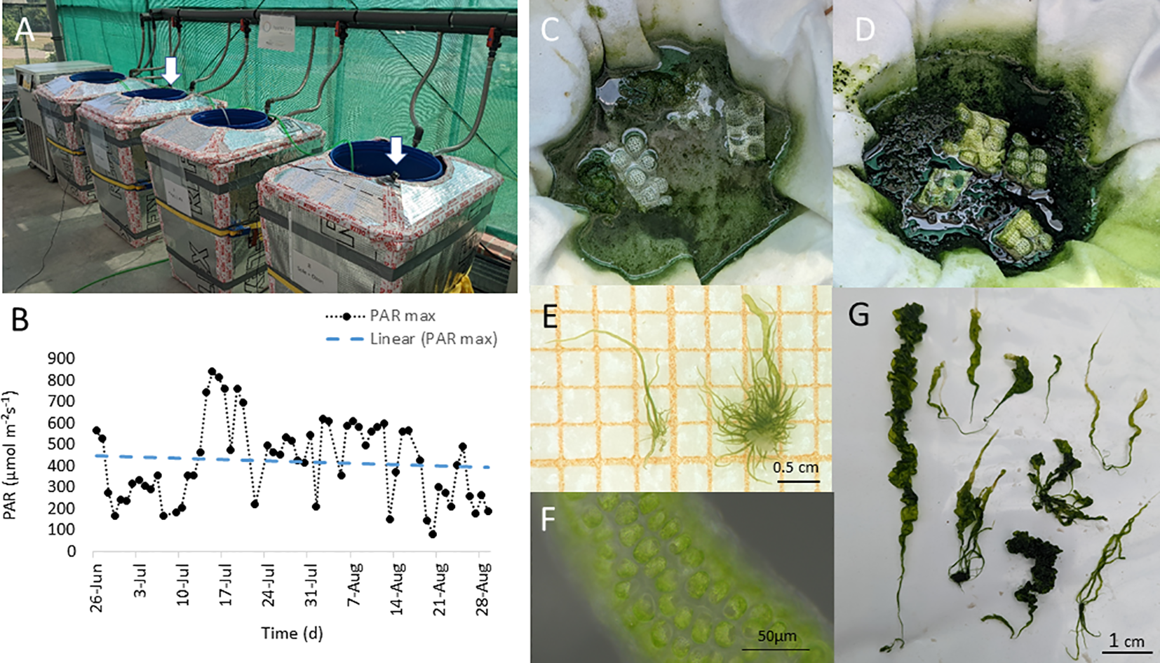 Ulva compressa. (A) Macroalgal cultivation system in the IGZ greenhouse facility. White arrows indicate position of photosynthetic active radiation (PAR) light loggers (LI-190SZ Quantum, LI-COR, equipped with a logger device, Loggito Logger, Delphin), exposed on the surface of the cultivation system and (B) measured daily PAR maxima over experimental time (26.6. to 29.8.2022), with decreasing linear trend indicated by dashed line (slope: m = -0.7752). (C) Experimental units, alternating filled with different media: (D) artifical seawater (Tropic Marine Classic, Tropic Marine, Germany) 2.4 PSU salinity and (C) brine-based media, orginating from the Thermal bath Bad Saarow (Brandenburg, Germany). (E–G) germlings (E), mature cells (F) and grown thalli (G) of the macroalga U. compressa grown in brine based medium.