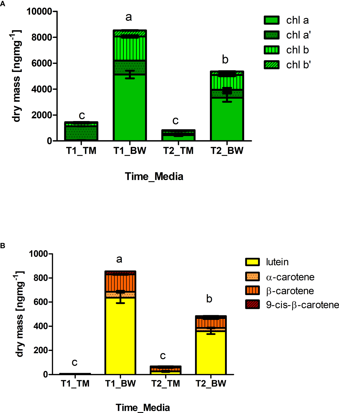 Likewise, the mineral composition, strong differences were also found in the photosynthetic pigments. Concerning the chlorophylls 6 times higher total concentrations were found in the algal thalli cultivated in the BW compared to the TM, reaching average concentrations of 8.53 ± 0.71 µg mg−1 dry mass (59.88 ± 10.17 mg 100 g−1 FW) after 52 days of cultivation (Figure 2A and Supplementary Table S4). The chlorophyll composition changed over time showing differences between the applied. In the BW chlorophyll b, chlorophyll b′ and chlorophyll a′ decreased significantly over time (Table 4). In contrast no changes in chlorophyll b or b′ were observed in the TM, but alterations in the chlorophyll a/chlorophyll a′ pool. Thus, the relative concentrations of chlorophyll a′ decreased, while chlorophyll a increased over time. Corresponding to the chlorophylls also the carotenoids showed strong differences between cultivation media and over time. Highest concentrations of all measured carotenoids were found in the BW media, reaching average concentrations of 0.86 ± 0.1 µg mg−1 dry mass (6.01 ± 1.15 mg 100 g−1 FW) after 52 days and exceeding the TM cultivated concentration of about 150 times (Figure 2B and Supplementary Table S5). Over cultivation time concentrations of total and individual carotenoids decreased in the BW media (Table 4), whereas total carotenoid concentration in the TM media increased with time, due to significant increase in β-carotene and 9-cis-β-carotene. These patterns lowered the difference between the media, which showed still a 6 times higher total carotenoid concentration in the BW after 88 days of cultivation.