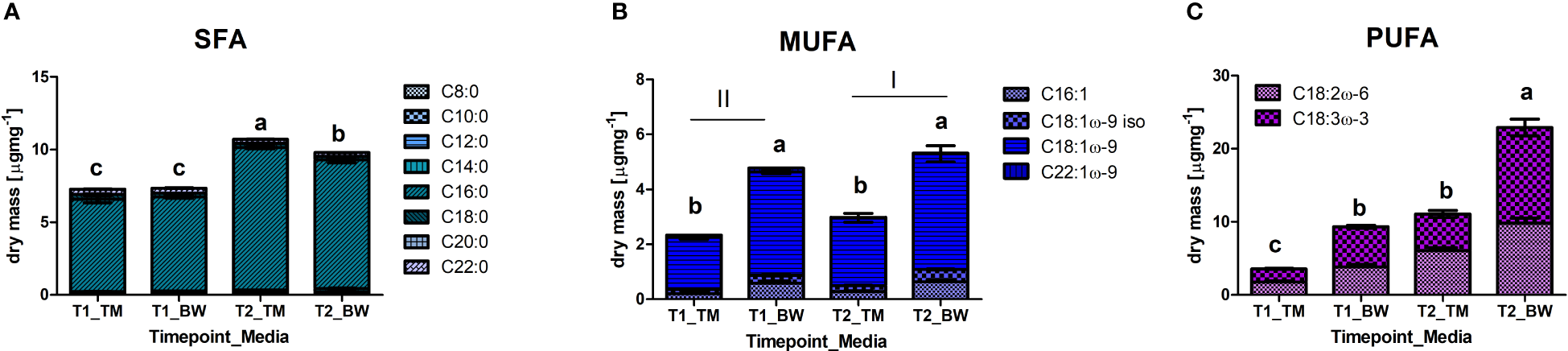 Fatty acids were analyzed as corresponding methyl esters for U. compressa following the protocol of (Harbart et al., 2022), using 5 mg lyophilized algal material homogenized to a fine powder, extracted and derivatized using 1,000-µL methanolic hydrochlorid acid (HCl/MeOH (1:3, v/v + 5% 2,2-Dimethoxypropane) with the addition of 250 µL internal standard (0.02 mg mL−1 margaric acid in THF/MeOH (1:1, v/v). After an hour incubation at 300 rpm on a thermos shaker, under nitrogen atmosphere and temperature of 80°C samples were cooled down to room temperature and 750 µL n-hexane and 1,000 µL of a saturated sodium chloride solution were added. Samples were vortexed and centrifuged at 4500 rpm for 5 min. Five hundred microliter of the upper hexane phase was collected and filtrated over a Pasteur pipette column, filled with sodium sulfate. Two hundred microliter of the eluent was transferred in 1.5 mL glass vials with inserts and put under nitrogen atmosphere. Fatty acid methyl esters (FAMES) were analyzed with an Agilent 8890 GC System equipped with a J&W DB-23 GC Column, 5977B GC/MSD (Agilent Technologies, Santa Clara, USA) at a flow rate of 1.2 mL min−1 and helium as carrier gas (230°C, 76.7 kPa 15.3 mL min−1). The following temperature program was used for elution: 80°C for 2 min, 80°C–120°C with 5°C min−1, 120°C–220°C with 2°C min−1, held at 220°C for 5 min. Compounds were detected with an Agilent 5973 mass selective detector. The source temperature was set to 230°C, the quadrupole temperature was set to 150°C and the voltage was set to 953 V. Analysis was performed in scan mode using a mass range between m/z 60 and 400. Fatty acids were identified as their methyl esters by comparing retention time and mass spectra with those of standards (FAME, Merck KGaA, Darmstadt, Germany). For quantification the internal standard magarinic acid (≥ 98 %) was used and response factors of the fatty acids of interest were determined. The data were analyzed with the software Quant-My-Way v10.2 (Mass Hunter, Agilent Technologies, Santa Clara, USA). For comparison, fatty acids were grouped according their saturation state in saturated fatty acids (SFAs), monounsaturated fatty acids (MUFAs) and polyunsaturated fatty acids (PUFAs). In addition to evaluate the nutritional value, we calculated the ω-6/ω-3 ratio based on (Simopoulos, 2010).