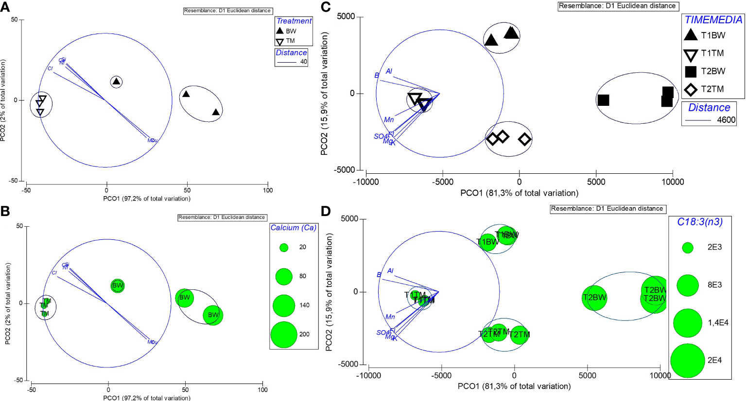 Mineral composition not only strongly differed between the two media but was also significantly altered during the cultivation process (Tables 1 and 2, Supplementary Table 1). Concerning potential contamination, all measured potential element concentrations laid below the thresholds provided by the German Drinkwater Ordinance (TrinkwV, Table 1), whereas some of the nutritive elements like chloride, sulfate and corresponding sulfur, fluoride, sodium, boron, and manganese exceeded these levels. Comparing the elementary composition, the media differed significantly from each other throughout the cultivation period (Table 2), mainly due to elevated sulfur, phosphorous and magnesium concentrations in the artificial seawater (TM), whereas the brine-based medium (BW) exceeded the TM especially in its silicon concentrations of about 38 times (Table 1). Except for the macroelements florid and sodium, significant decreases in concentrations were measured for most of the different elements over cultivation time (Tables 1, 2). Whereas a decrease in minerals was only visible for the medium which showed comparable higher concentrations, thus phosphorous, manganese and zinc decreased only in TM, whereas calcium and silicon lowered their concentration only in BW (Table 1). These different depletions lead to significant time wise shifts in the media composition (Table 2).