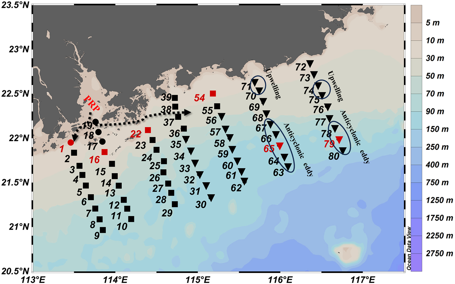 Location of sampling stations in the northern South China Sea. The stations tagged by dots, squares, and inverted triangles denote stations influenced by PRW, PDW, and SSW water masses, respectively. The stations in red denote the stations where the samples were collected for the determination of cell volume and biomass. The dashed arrow indicates the direction of the Pearl River plume (PRP) (Shu et al., 2018). The stations influenced by upwelling and anticyclonic eddies are circled, respectively.