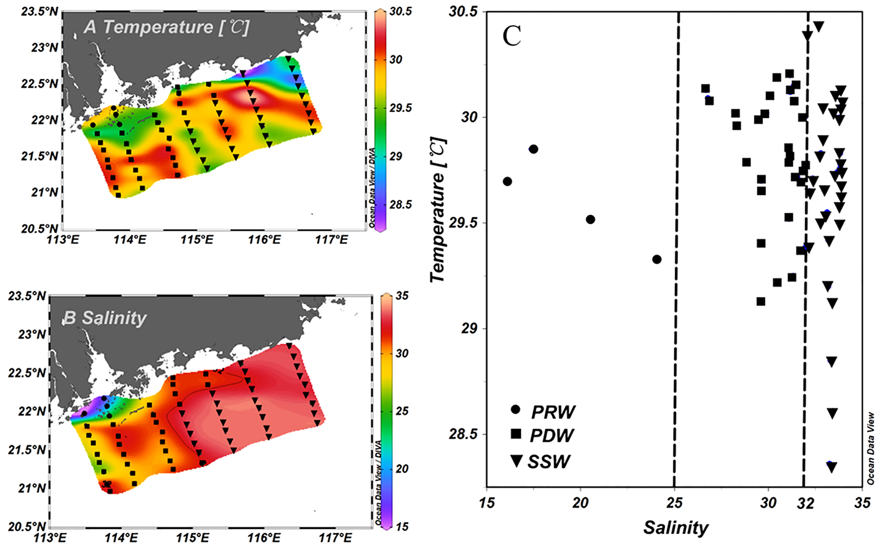 Horizontal distributions of surface temperature (A), salinity (B) and scatter plots of surface temperature and salinity (T–S) (C). The stations tagged by dots, squares, and inverted triangles denote stations influenced by PRW, PDW, and SSW water masses, respectively.