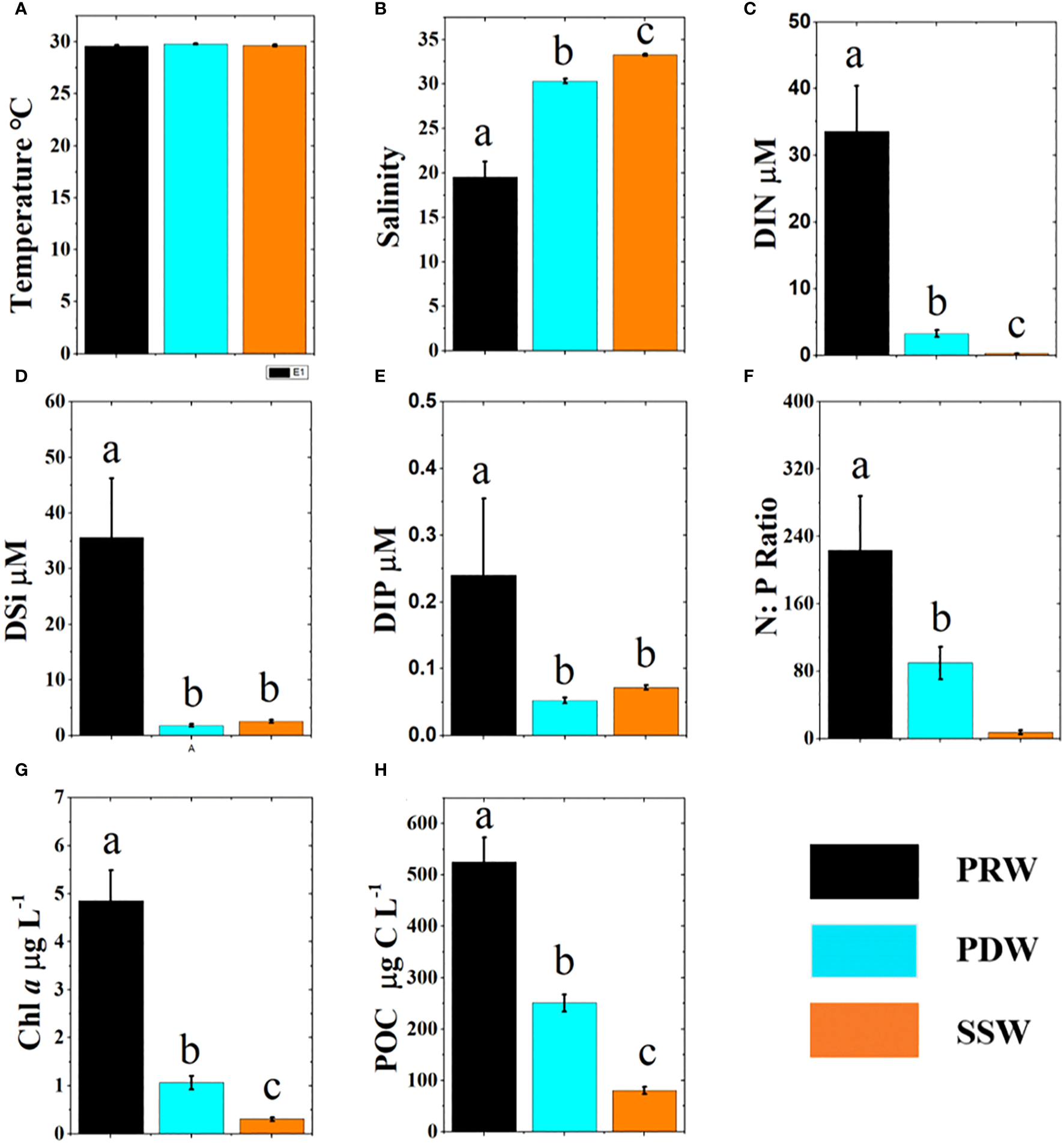 Comparison of environmental parameters (mean ± SE) between three water masses with columns of different colors. The different letters (a, b, c) in each plot indicate significant differences in parameters between the three water masses at least p<0.05. Temperature (A), Salinity (B), DIN (C), DSi (D), DIP (E), N:P Ratio (F), Chl a(G), POC (H).