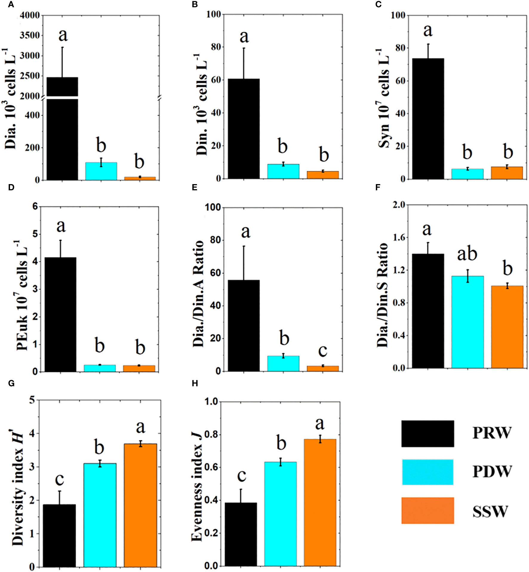 Comparison of ecological parameters (mean ± SE) between three water masses with different color columns. The different letters (a, b, c) in each plot indicate significant differences in parameters between three water masses at least p<0.05. Dia., Diatom abundance (A), Din., Dinoflagellate abundance (B), Syn: Synechococcus abundance (C), PEuk, Picoeukaryotes abundance (D), Dia./Din.A, Abundance ratio of diatom and dinoflagellate (E), Dia./Din.S ratio, Species ratio of diatom and dinoflagellate (F), Diversity index (G), Evenness index (H).