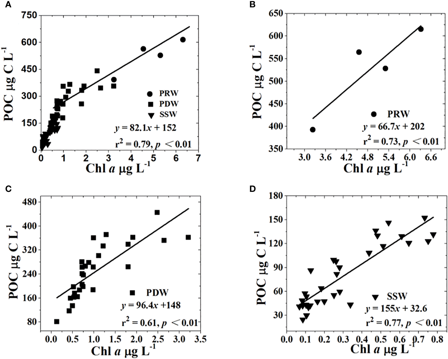 Relationships between POC and Chl a concentrations at the study stations. The symbols tagged by dots, squares, and inverted triangles denote stations influenced by PRW, PDW, and SSW water masses, respectively. All stations (A), PRW stations (B), PDW stations (C), SSW stations (D).