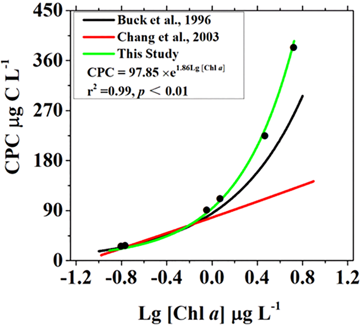 Based on the phytoplankton carbon content estimated by cell volume at the six stations, the relationship between phytoplankton carbon and Chl a was obtained, which is expressed as follows (Buck et al., 1996):