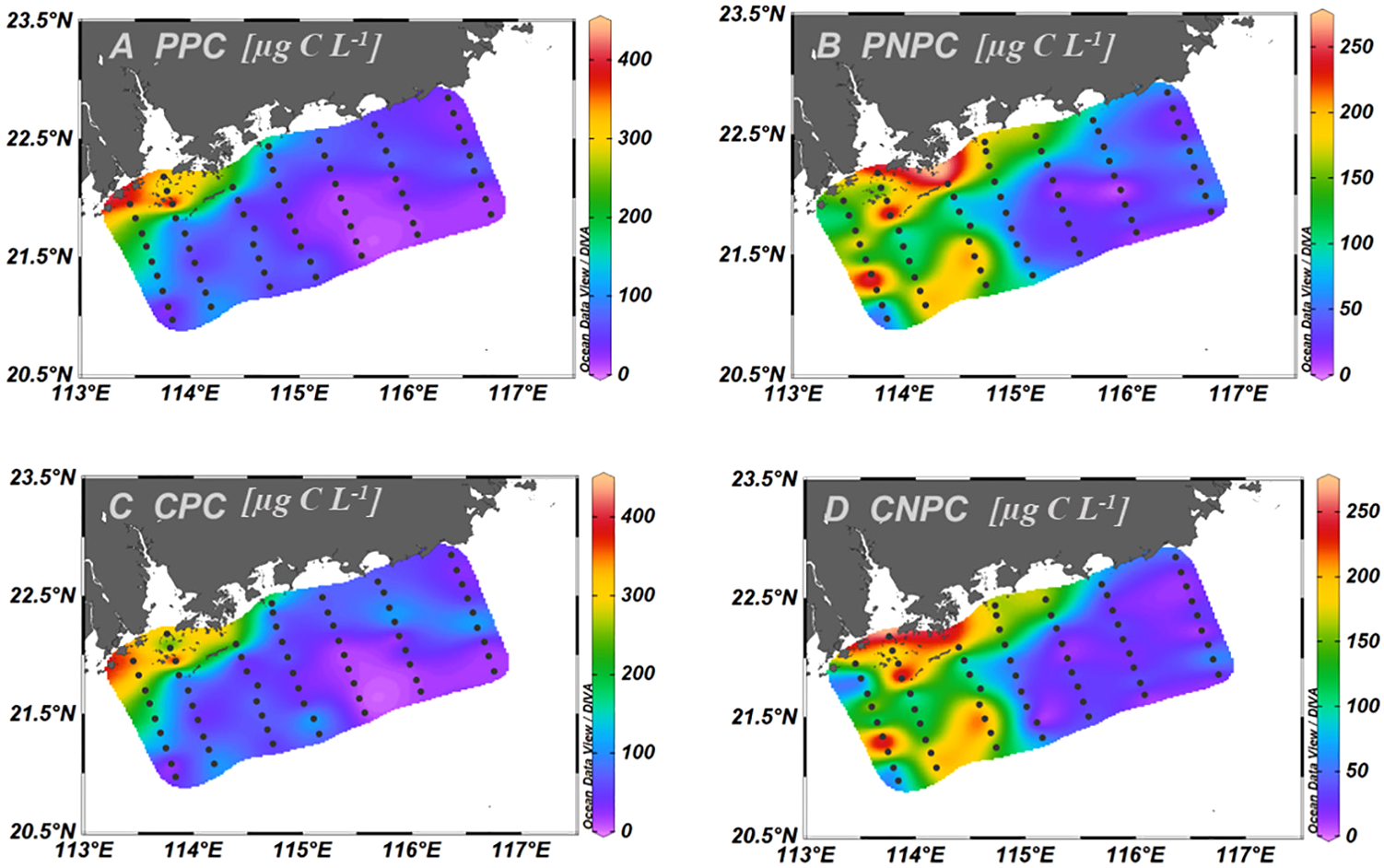 For the conversion of cell abundance to carbon biomass, factors of 24 fg C cell−1, 67 fg C cell−1, and 293 fg C cell−1 were used for Pro, Syn and PEuk, respectively (Liu et al., 2007b; Wei et al., 2020).