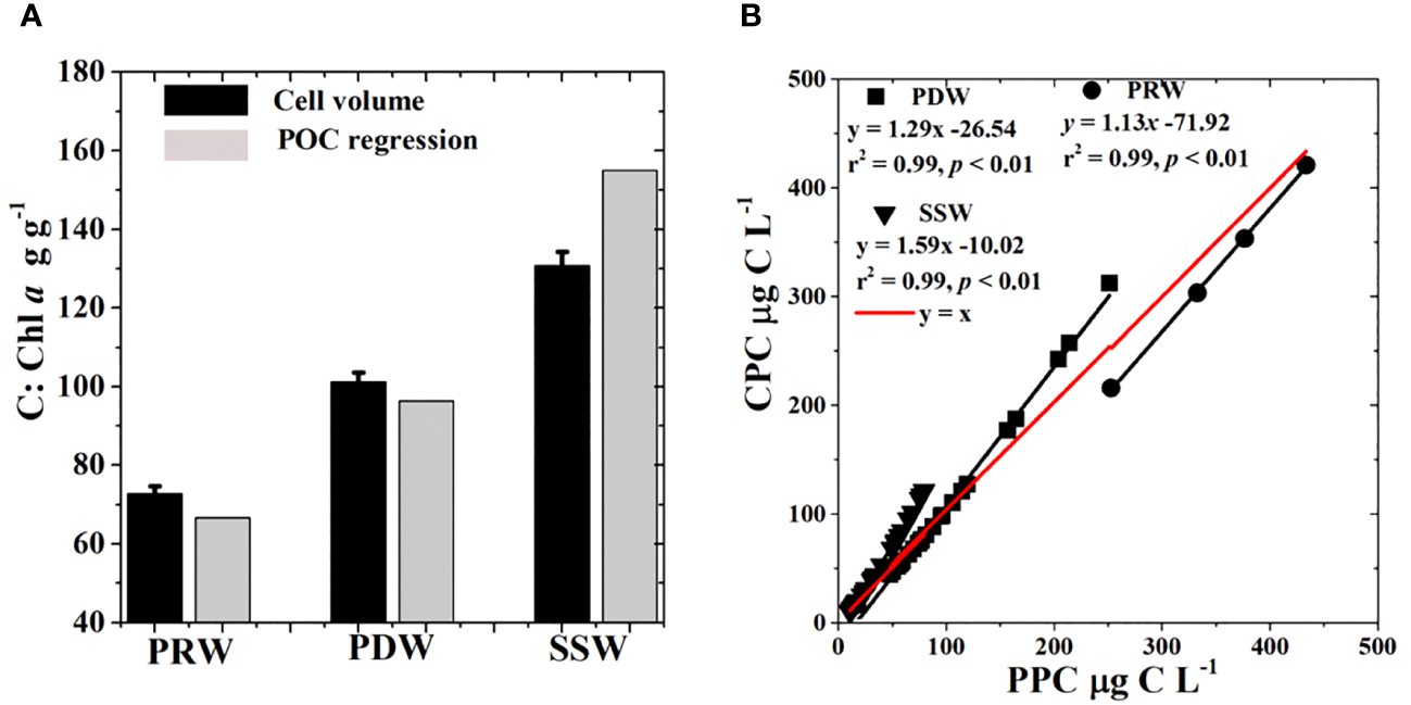 The mean C:Chl a ratio was 82.1 g g−1 throughout the study area, which was derived from the relationship between POC and Chl a at all stations (Figure 8A; Table 2). The C:Chl a ratios based on the linear relationships between POC and Chl a concentrations differed among the three water masses, which increased from the PRW (66.7 g g-1) to PDW (96.4 g g−1), to SSW (155 g g−1) stations (Figure 8; Table 2).