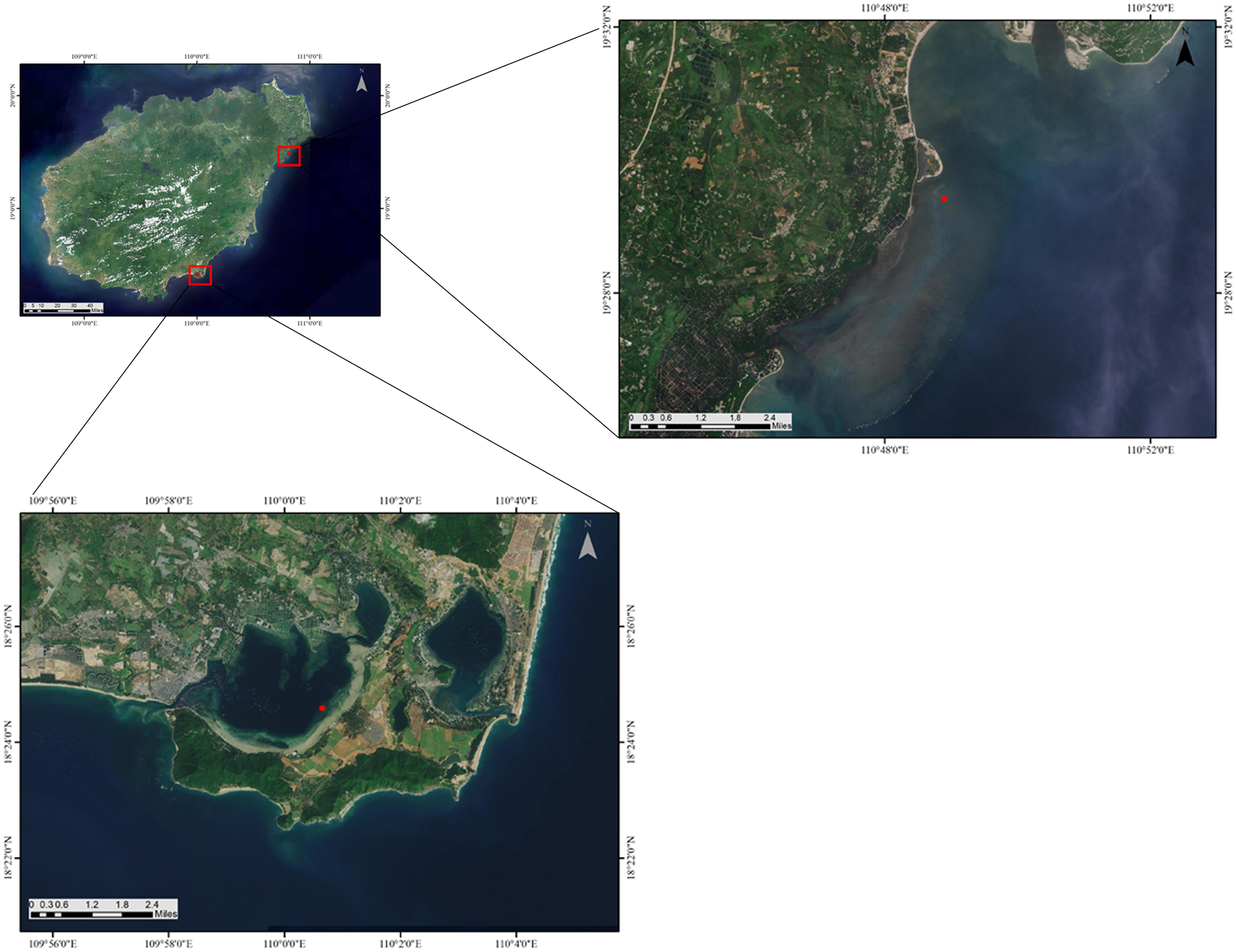 Seagrass restoration areas in Gaolong bay and Xincun lagoon, Hainan Island, China.