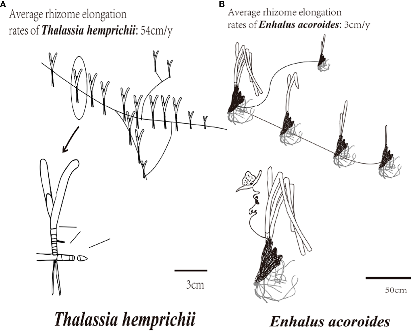 Branching rate and rhizome elongation rate of T. hemprichii and (E) acoroides. (A)T. hemprichii; (B)(E) acoroides.