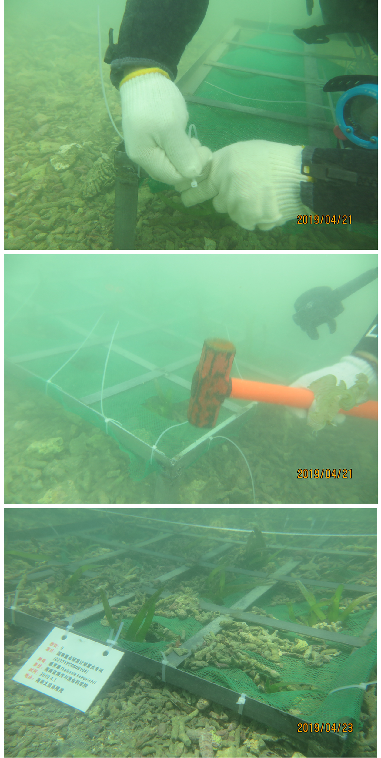 Seagrasses play a key role in biodiversity maintenance, sediment stabilization, and carbon reduction. Due to the significant decline of seagrass populations worldwide, many projects to restore seagrass by transplantation have been undertaken in recent decades. However, effective restoration technologies required to rapidly restore seagrass on Hainan Island are yet to be developed.