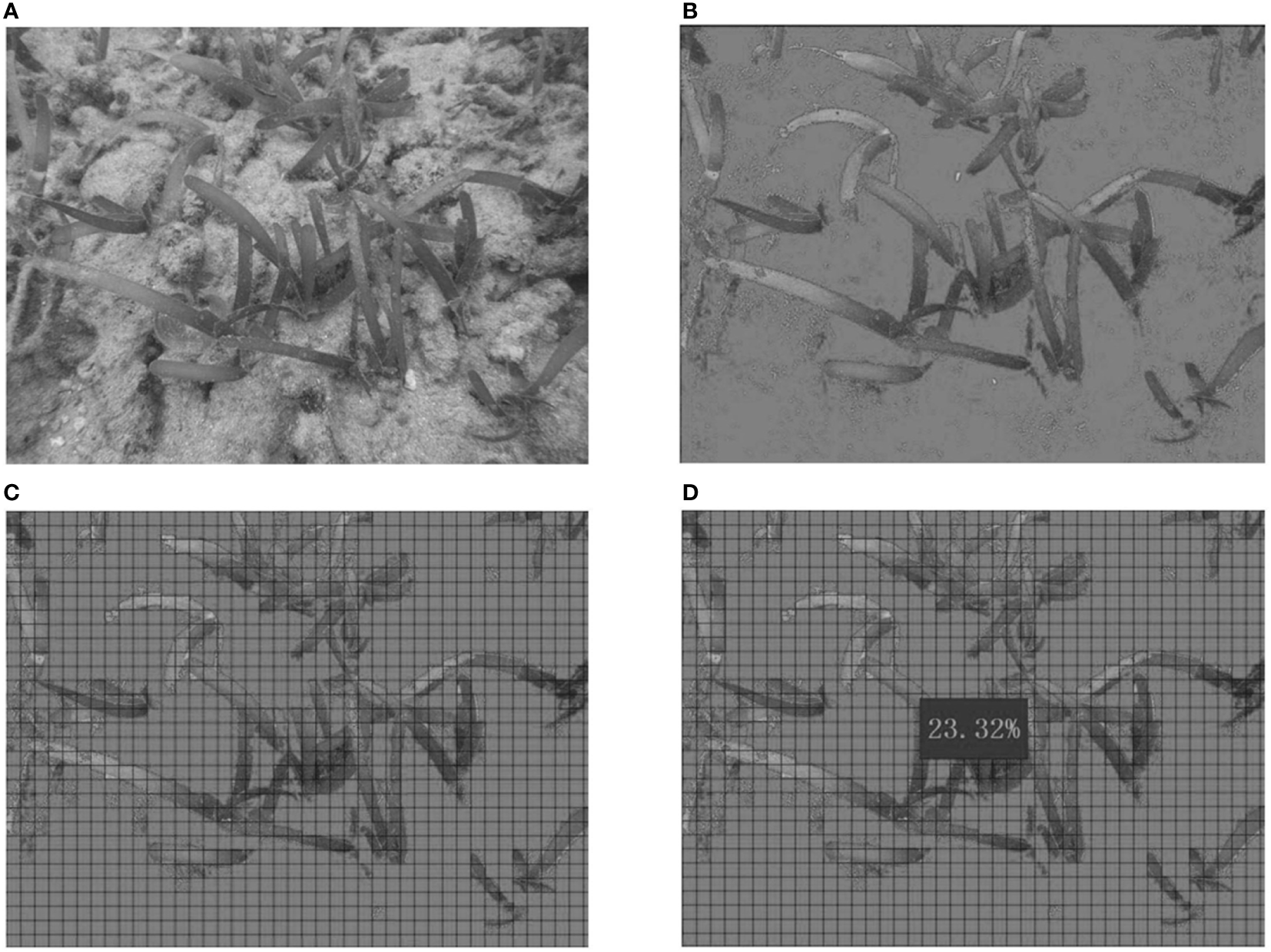 where, B is the seagrass propagation rate (%), Ni is the number of transplanting rhizomes with newly shoots in the ith transplanting unit, and U is the total number of shoots in each transplanting unit. Coverage: The percentage of vertical projected area of vegetation (including stems, branches and leaves) on the ground against the total area of the transplanting unit. The coverage was estimate through a photogrammetry-based Chinese patent “A method for determining vegetation coverage based on grb and gridlines”. Firstly, suit images of each transplanting unit were acquired by scuba divers (Figure 4A). The color value of each pixel was changed into Visible-band Difference Vegetation Index (VDVI) (VDVI = (2 × G – R - B)/(2 × G + R + B)), which is designed to distinguish green vegetation (Wan et al., 2018; Ventura et al., 2022). Depending on threshold setting to 0.25, an image object was determined whether belonged to cover class, then this pixel was defined “vegetation point” (Figure 4B). The suit image was added grid lines of 20 × 20 pixels (Figure 4C). To distinguish the vegetation from sediment, we set two threshold values. When the “vegetation point” coverage was over 80% of a grid, the grid would be defined “vegetation grid”. If the “vegetation point” coverage was less than 20%, the grid would be defined “background grid”. Finally, the coverage was estimated by calculating the ratio of “vegetation grids” to total grids (Figure 4D).