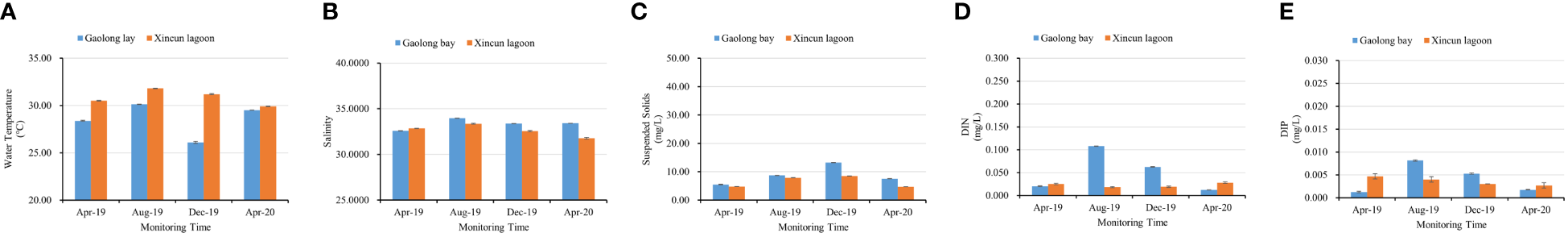 The water temperature showed a clear temporal variation, it was high during summer and low during winter and spring. In Gaolong bay, the highest value was 30.12° in Aug 2019, and lowest value was 26.1° in Dec 2019. In Xincun lagoon, the highest value was 31.80° in Aug 2019, but the lowest value was 29.90° appeared in Apr 2020. The average of water temperature changed significantly (P<0.001) both in Gaolong bay and Xincun lagoon with sampling every 4-months (Figure 5A; Supplementary Table S1).