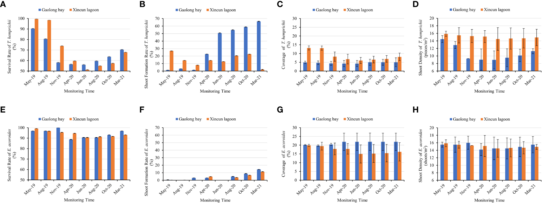 Comparison of the survival rate, shoot formation rate, coverage, and shoot density between T. hemprichii and (E) acoroides in Gaolong bay and Xincun lagoon. (A) the survival rate of T. hemprichii; (B) the shoot formation rate of T. hemprichii; (C) the coverage of T. hemprichii; (D) the shoot density of T. hemprichii; (E) the survival rate of (E) acoroides; (F) the shoot formation rate of E. acoroides; (G) the coverage of E. acoroides; (H) the shoot density of E. acoroides.