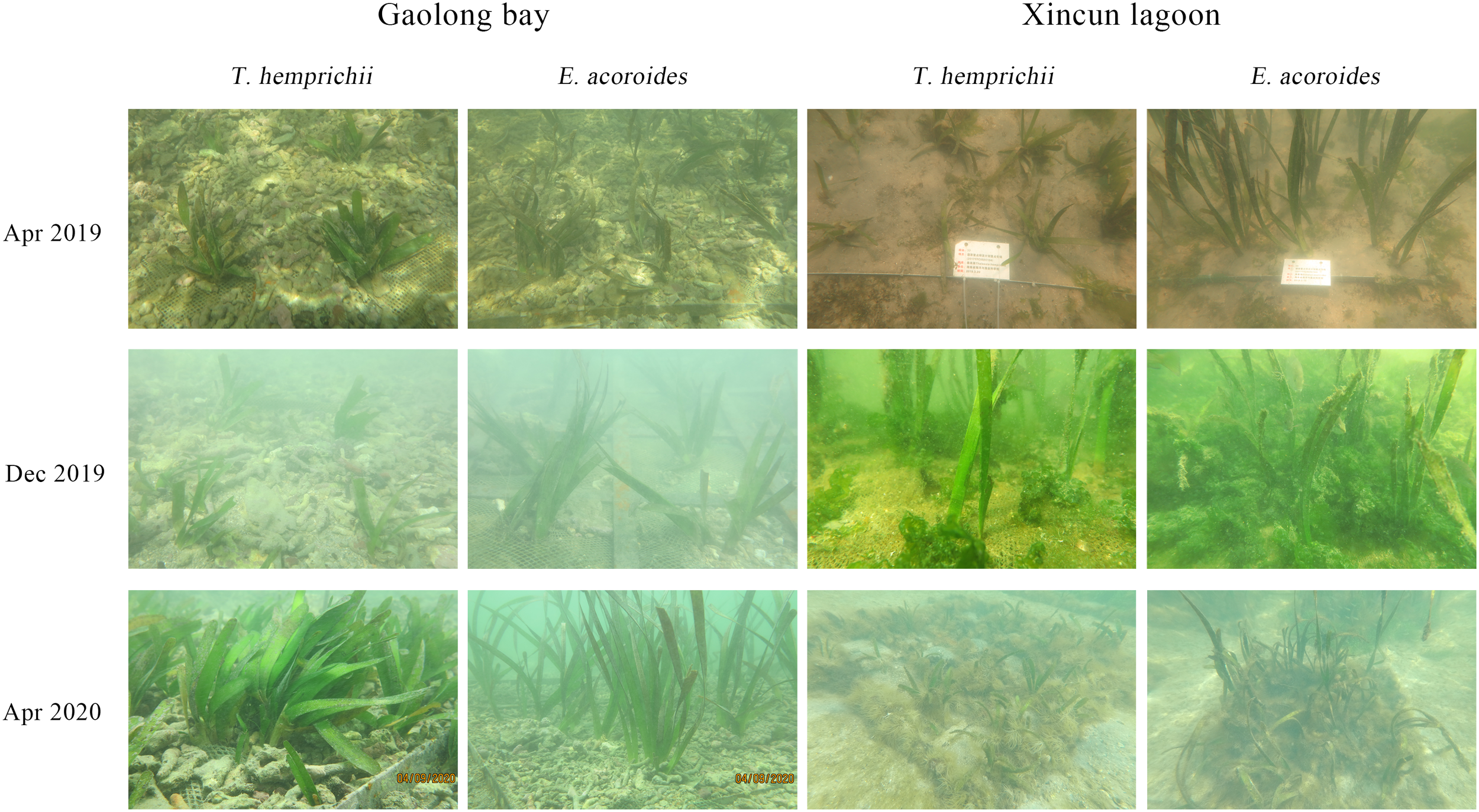 To compare the restoration performance of T. hemprichii and E. acoroides in Gaolong bay and Xincun lagoon, we selected the transplant sites with similar habitat conditions.