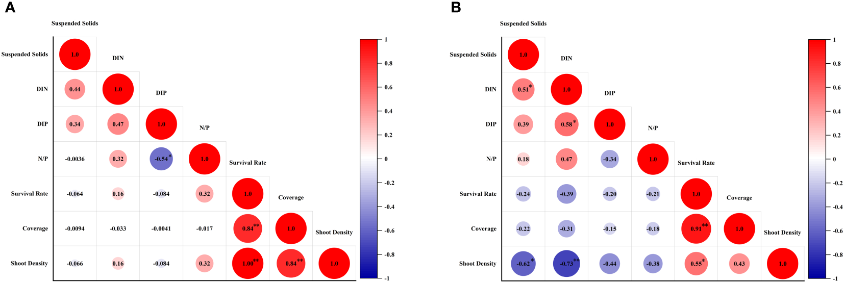 The survival rate, shoot formation rate, coverage and shoot density of transplantion were taken into pertinence analysis with environmental parameters. The results showed that, there was no relationship of contents of suspend solids, DIN, DIN, and N:P ratio with survival rate, coverage and shoot density of transplantion in Gaolong bay (Figure 8A). While in Xincun lagoon, content of suspend solids and DIN had both significant negative correlations with shoot density (Figure 8B).