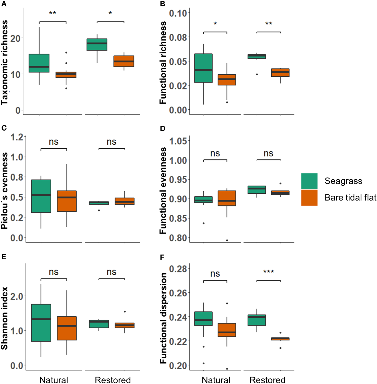 Taxonomic and trait-based indices inside and outside seagrass in natural meadows and in the restored meadow: (A) Taxonomic richness (B) Functional richness, (C) Pielouâs evenness, (D) Functional evenness, (E) Shannon index and (F) Functional dispersion. Boxplots show median (line in box), upper and lower quartile (box), 1.5 x interquartile range (vertical line) and outliers (circle). The indices were calculated with count-data (indviduals/m²). Stars indicate significance of p<0.001 for ***, p<0.01 for ** and p<0.05 for *. Statistically non-significant results are indicated with ns.