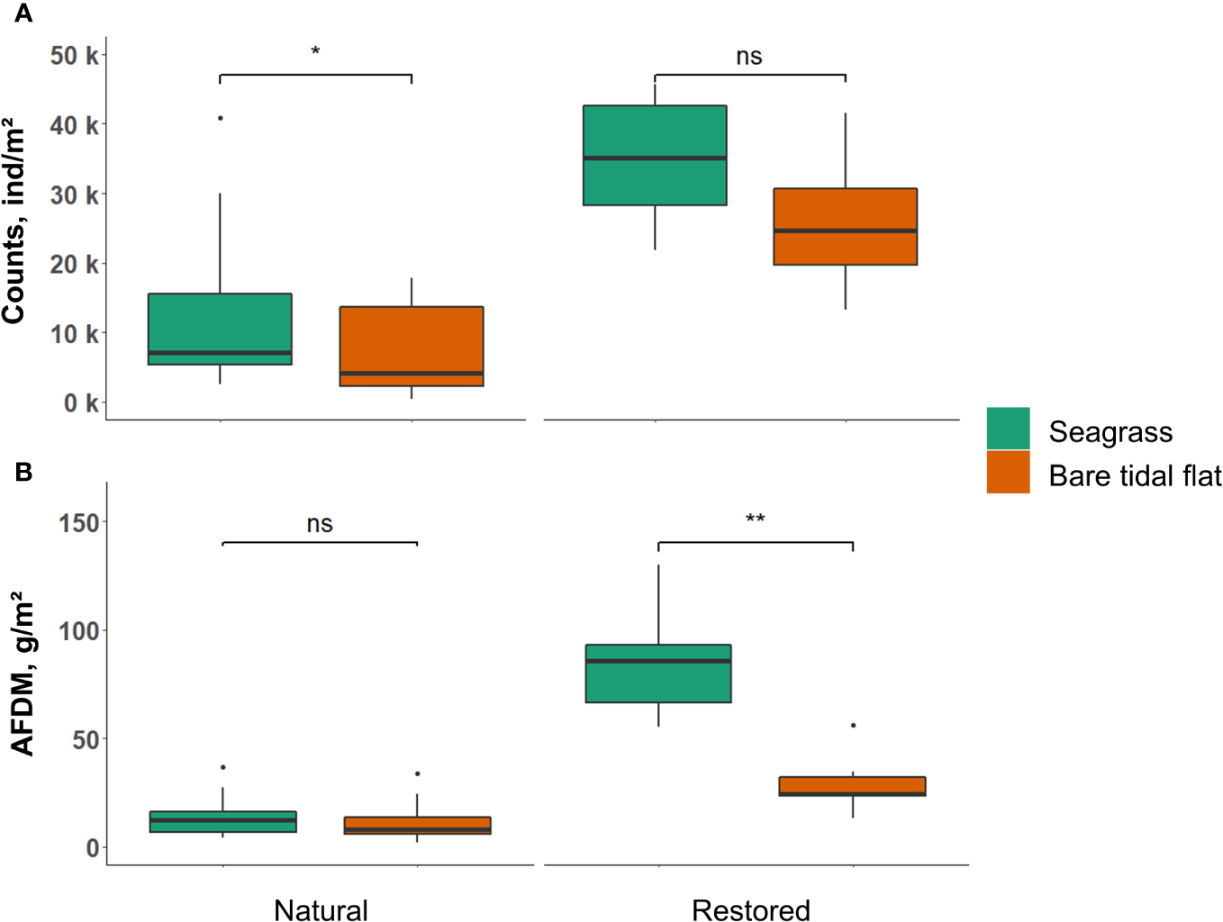 (A) Counts of individuals and (B) AFDM of macrozoobenthos inside and outside seagrass in natural meadows and at the restoration site. Boxplots show median (line in box), upper and lower quartile (box), 1.5 x interquartile range (vertical line) and outliers (circle). Stars indicate significance of p<0.01 for ** and p<0.05 for *. Statistically non-significant results are indicated with ns.