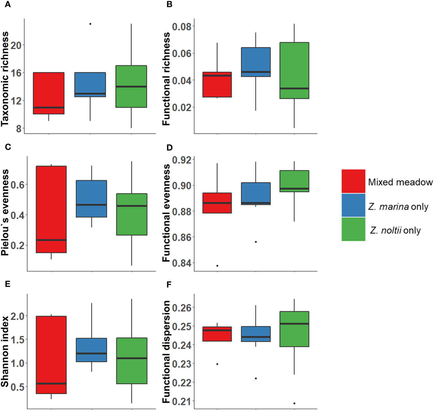 Taxonomic and trait-based indices of different seagrass meadow types [Mixed meadow (both seagrass species present; n=5), monospecific Z. marina (n=8) and monospecific Z. noltii (n=9)] in the Wadden Sea: (A) Taxonomic richness (B) Functional richness, (C) Pielouâs evenness, (D) Functional evenness, (E) Shannon index and (F) Functional dispersion. Boxplots show median (line in box), upper and lower quartile (box), 1.5 x interquartile range (vertical line) and outliers (circle). The indices were calculated with count-data (indviduals/m²). No statistical differences were detected.