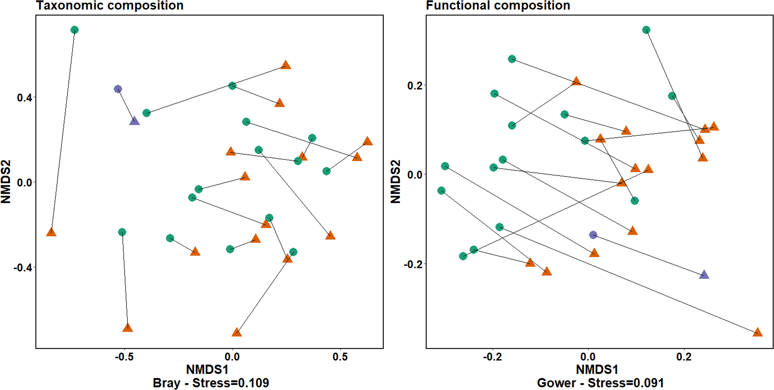 nMDS on taxonomic composition based on count-data and functional composition based on CWM values. Green circles indicate seagrass, orange triangles bare areas and the blue color indicates the two data points of the restoration site. Lines between points signify that data belongs to the same site.