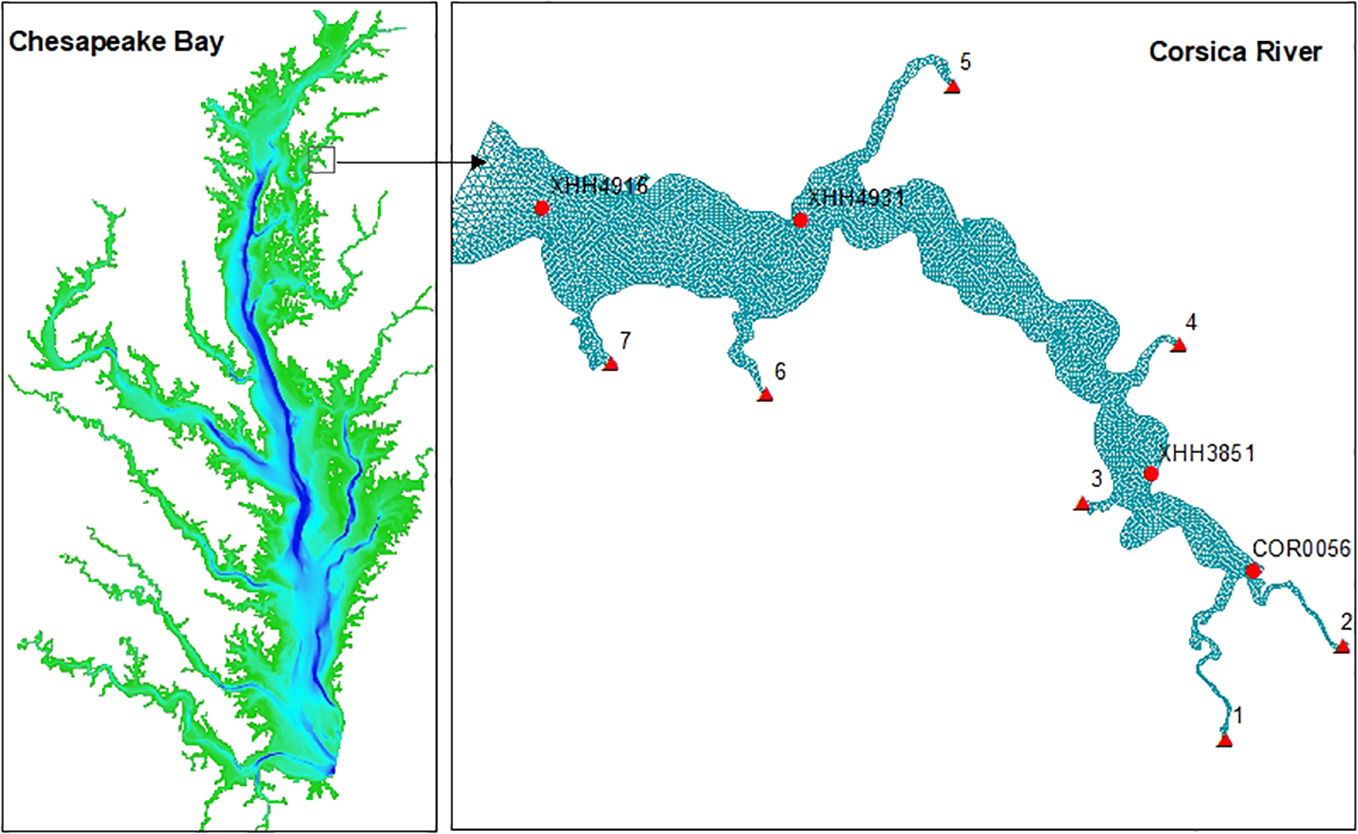 where ∇ is the differential operator del ; η(x,y,t) is the surface elevation; h(x,y) is the bathymetry; u(z,y,z,t) is the horizontal velocity; w is the vertical velocity; F represents other forcing terms such as baroclinic gradient , horizontal viscosity, Coriolis force, tide, and atmospheric pressure; C is the tracer concentration; ν is the vertical viscosity; κ is vertical eddy diffusivity; and Fh represents the horizontal diffusion and source/sink terms. Flexibility in space and time is the key feature in SCHISM for this study. The unstructured grid ensures that the model fits the complex shoreline in the Corsica River, and the terrain-following vertical grid guarantees fine vertical resolution without bathymetry smoothing. The semi-implicit feature enables the flexibility in the time step and model advancement during the simulation.