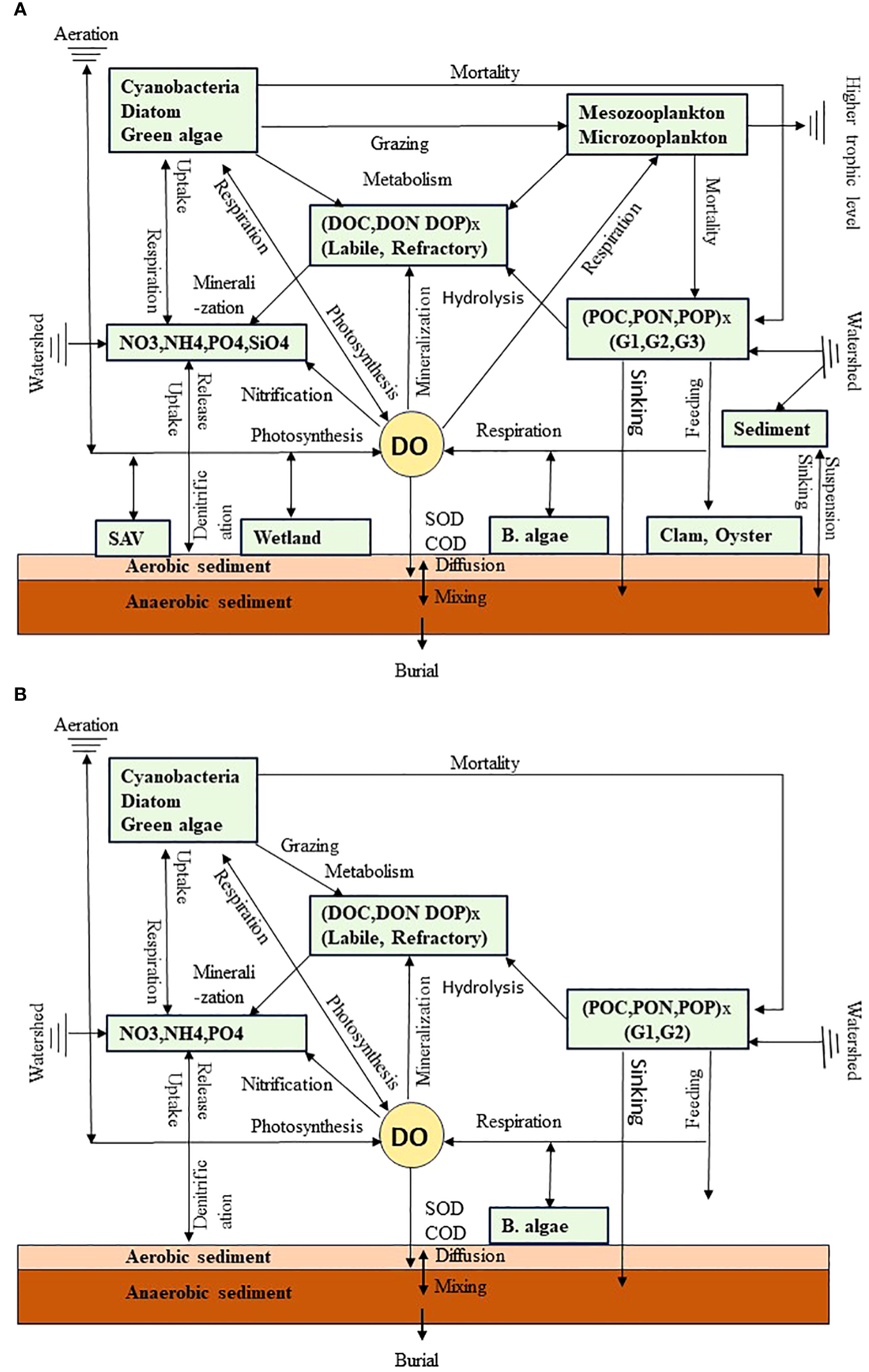 Figure 2 (A) Diagram of the major compartments and energy flows in the water quality model ICM. G1, G2, and G3 are the particulate organic compartment categories based on their reactivity (G1: labile; G2: refractory; and G3: inert). COD is chemical oxygen demand, SOD is sediment oxygen demand, and SAV is submerged aquatic vegetation and sediments including sand, silt, clay, and organic detritus. (B) State variables turned on for this study.