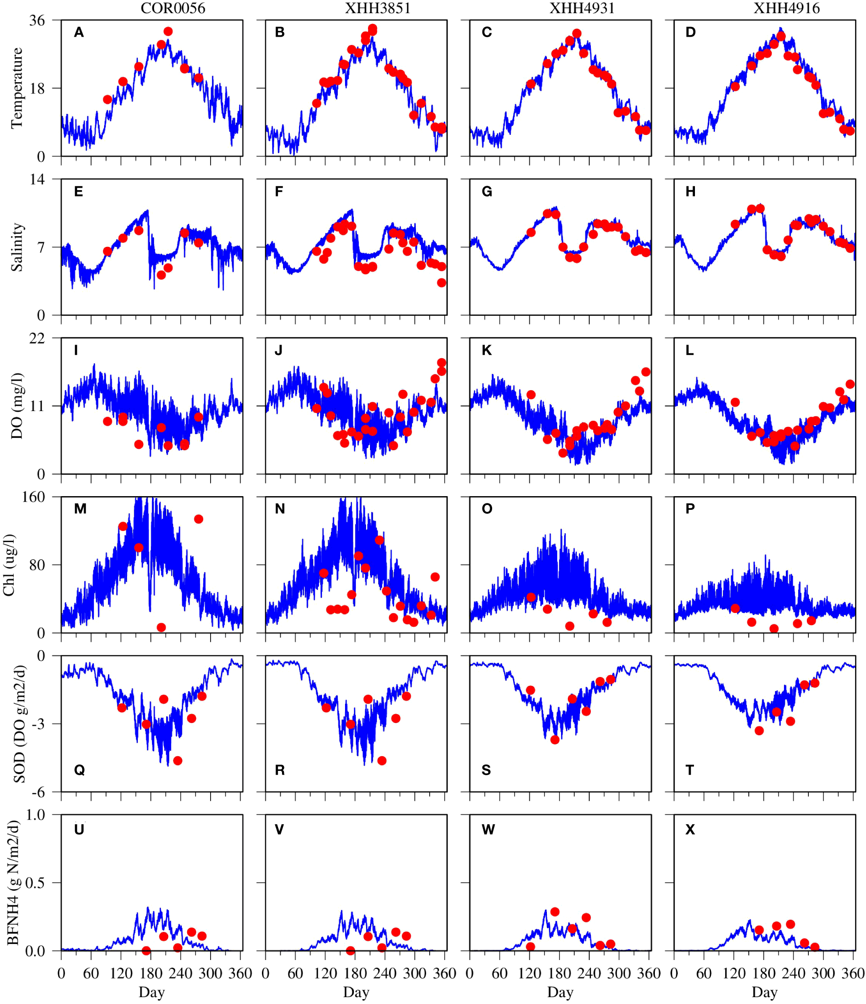Figure 4 Comparison between model simulations (blue lines) cruise-based, discrete sample data (red dots) at four observation stations for surface water temperature (A-D), salinity (E-H), DO (I-L), chlorophyll (M-P), sediment oxygen demand (Q-T) and ammonium flux at the sediment-water interface (U-X).