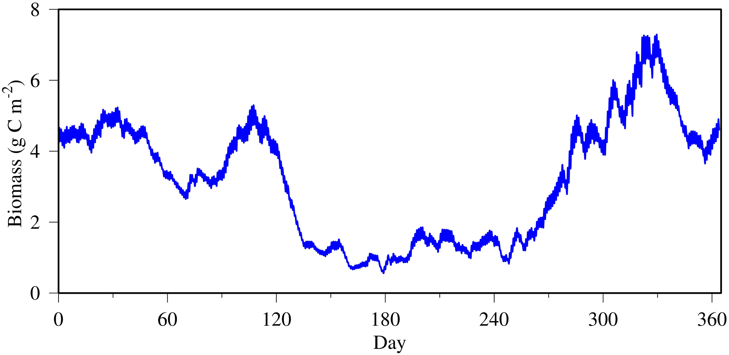 Figure 5 Time series of benthic microalgal biomass simulated at the tidal headwater station COR0056.