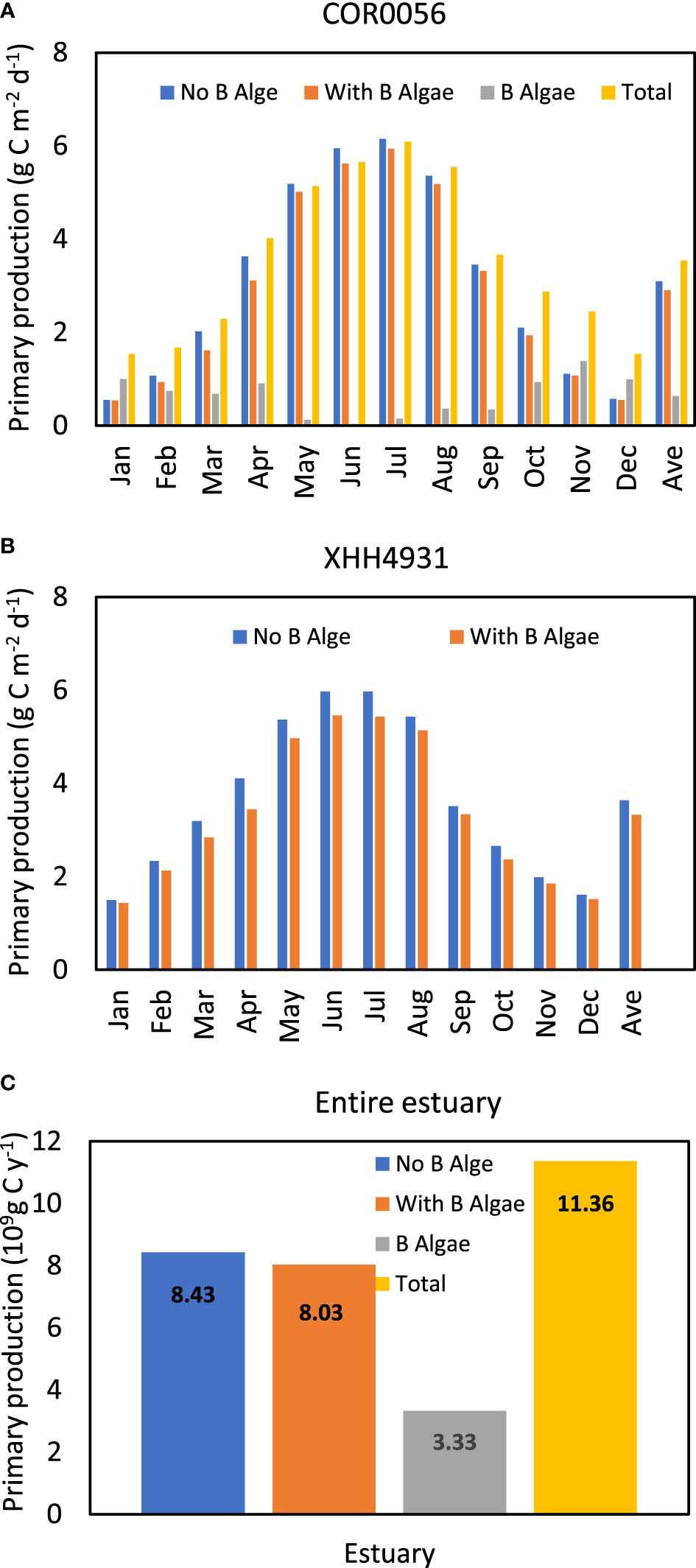 Figure 10 Primary production at the near-field station COR0056 (A), the far-field station XHH4931 (B), and integrated in the entire estuary (C) Blue is phytoplankton production in the control run without benthic microalgae, red is phytoplankton production in the scenario run with benthic microalgae, gray is benthic microalgal production, and orange is the total primary production with phytoplankton and benthic microalgae combined.