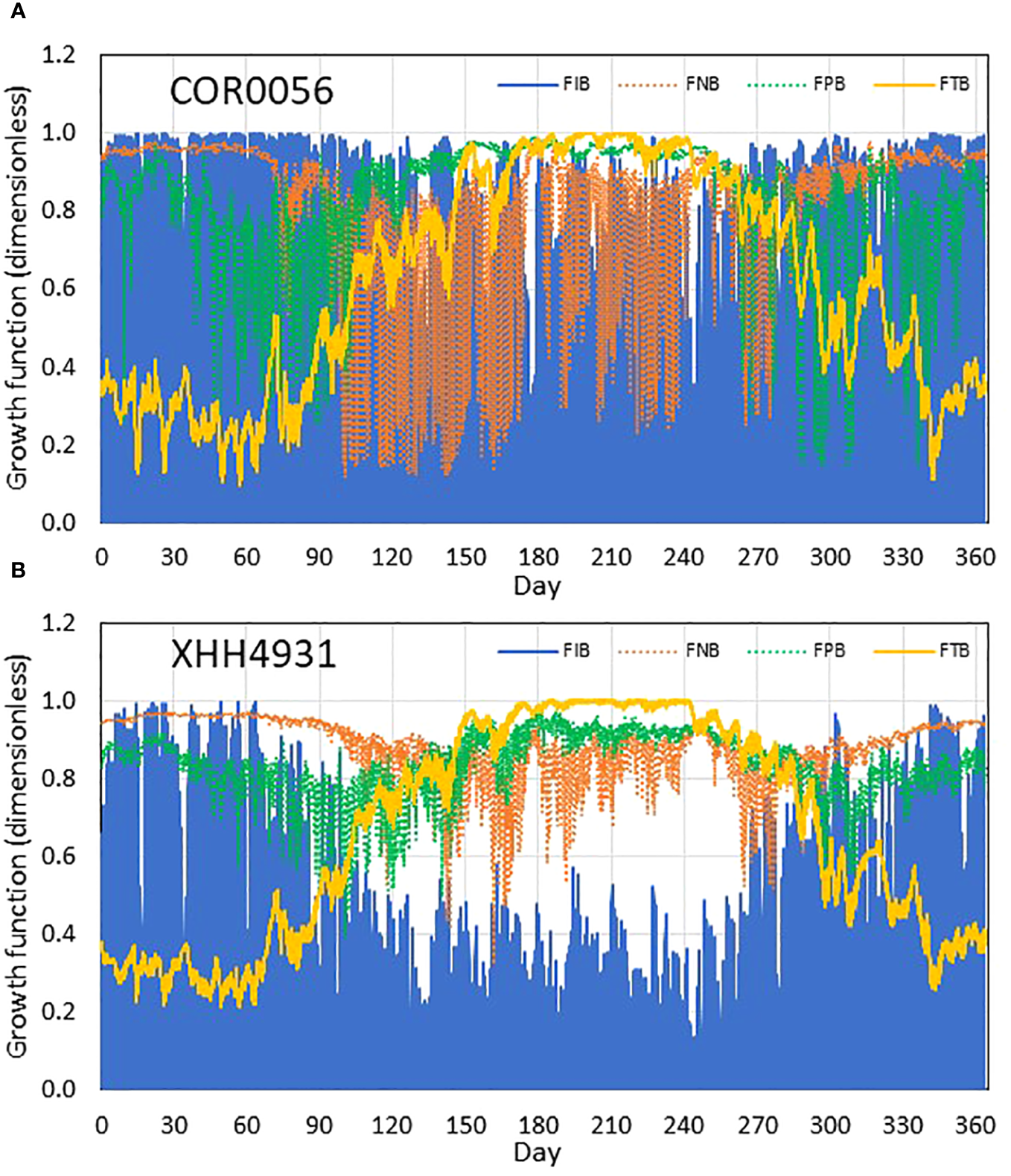Figure 11 Simulated benthic algal growth limitation factors of light FIB (blue), nitrogen FNB (dashed orange), phosphorus FPB (dashed green), and temperature FTB (yellow) at the near-field station COR0056 (A) and far-field station XHH4931 (B); 1 indicates no limiting effect from a particular resource, and 0 means full limiting effect. Due to the diel cycle, light is always limiting during the night, and its limiting effect is measured by the daytime values, i.e., the upper bound of the blue line.