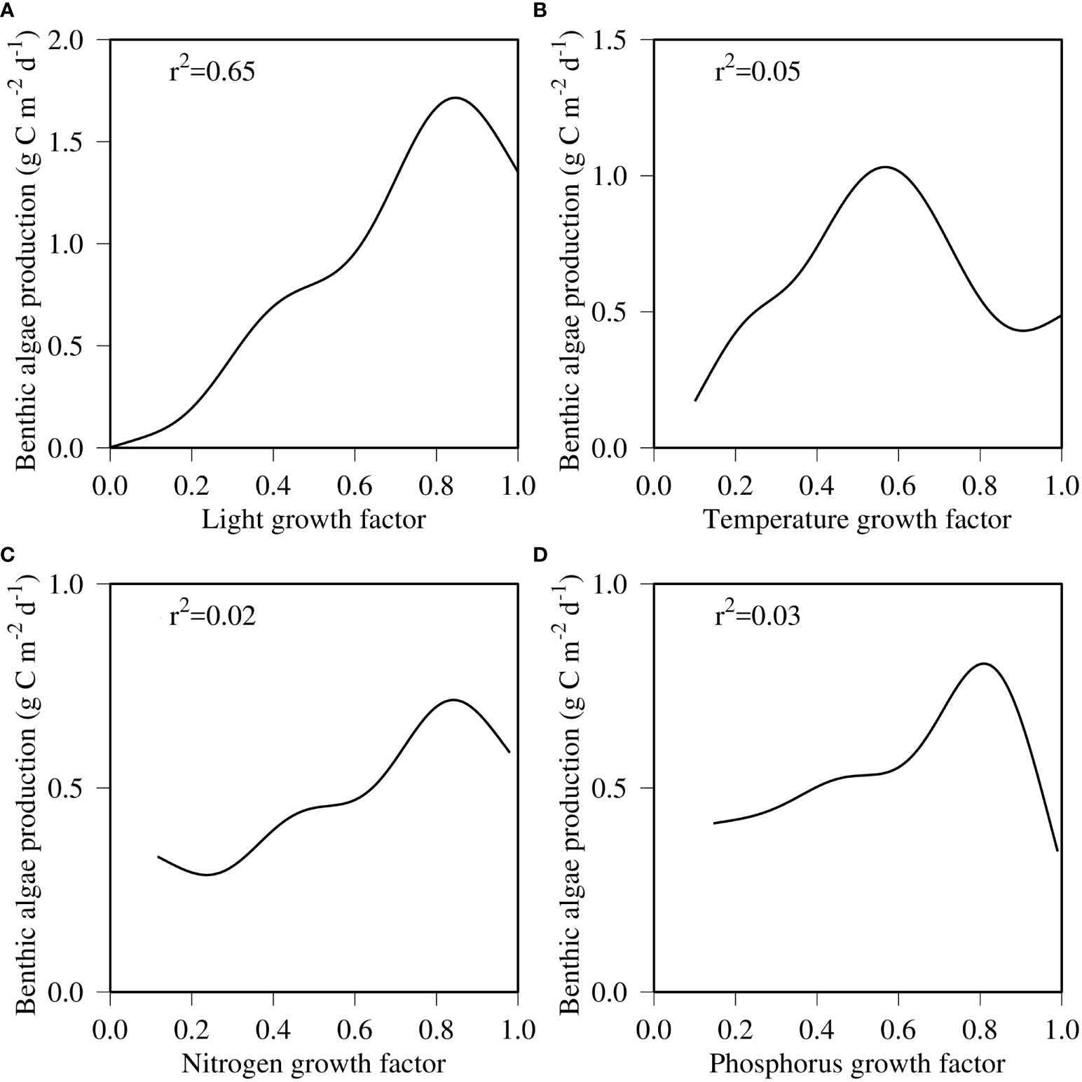 Figure 12 GAM-fitted function between benthic microalgal production and growth factors of light (A), temperature (B), nitrogen (C), and phosphorus (D) at the near-field station COR0056.