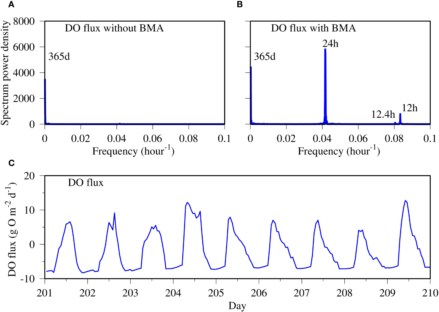 Figure 13 Spectral analysis of DO flux time series predicted in the control run without benthic microalgae (A) and in the scenario run with benthic microalgae (B) and 10-day time-series data of DO flux at the near-field station COR0056 (C).