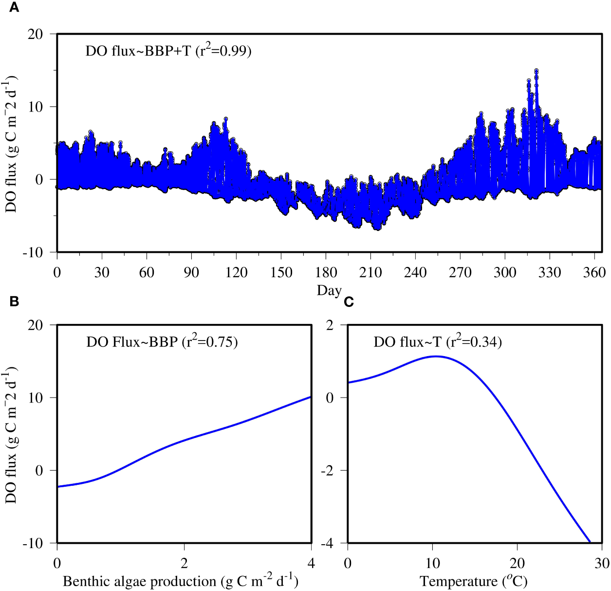 Figure 14 GAM prediction of the DO flux time series at the near-field station COR0056 (A) and fitted functions between DO flux and benthic algal production (B) and water temperature (C). Black circles are the original data of DO flux, and the blue line is the GAM prediction.