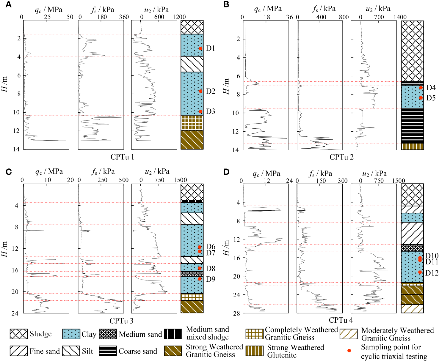CPTu results and soil layer classifications. (A–D are four different boreholes).