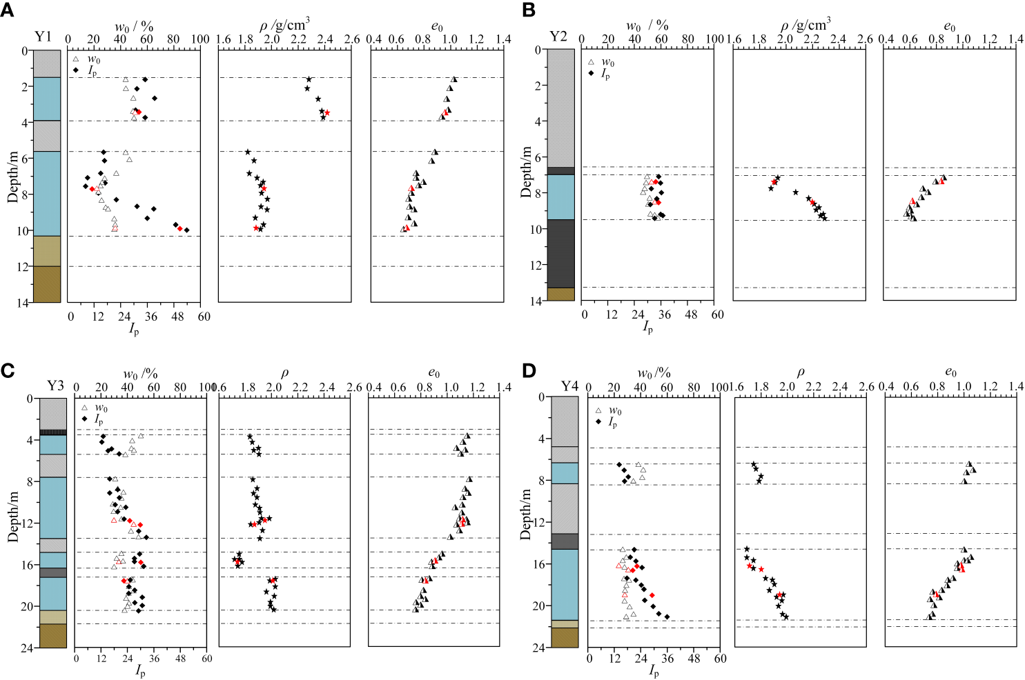Index properties of marine clay versus depth. (A–D are four different boreholes).