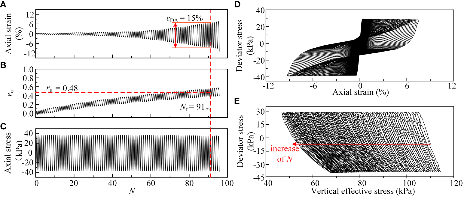 Undrained cyclic triaxial typical test results (A–E show five different typical test results).