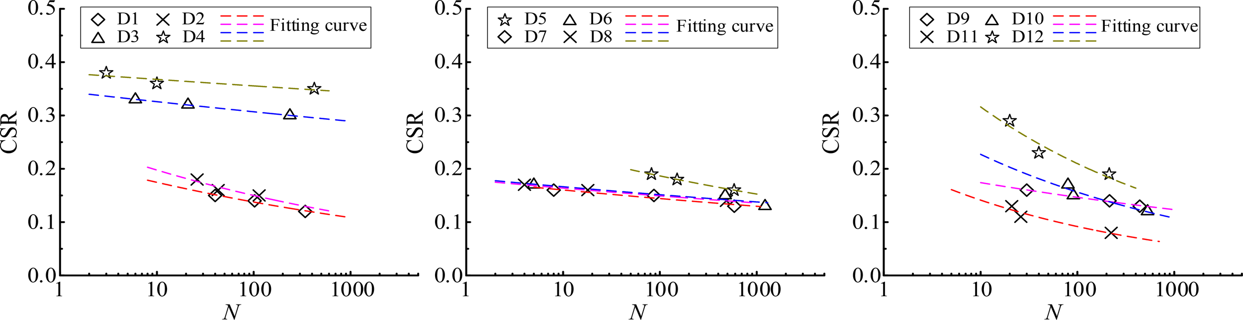 Figure 6 depicts the relationship curve between the CSR and Nf of the clay samples from the Shaba wind farm, with a dashed line representing the fitting curve. The results indicated that as CSR increases, Nf decreases, demonstrating that the marine clay is more prone to damage under high cyclic loading conditions. However, the change pattern in cyclic resistance for each specimen remains unclear.