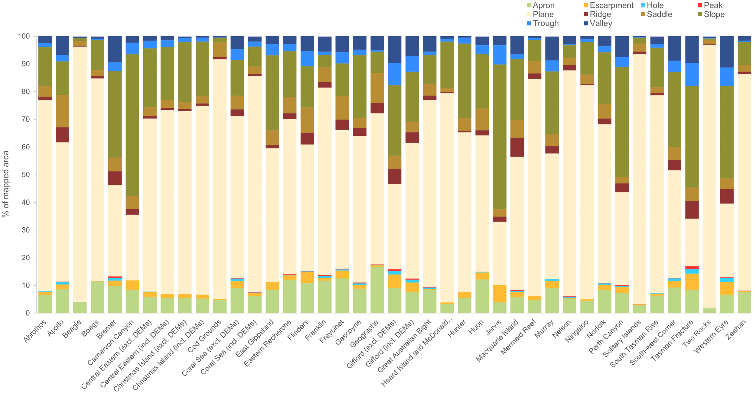 Stacked box plot showing the dominant geomorphometry class (% of mapped area) by Australian Marine Park.