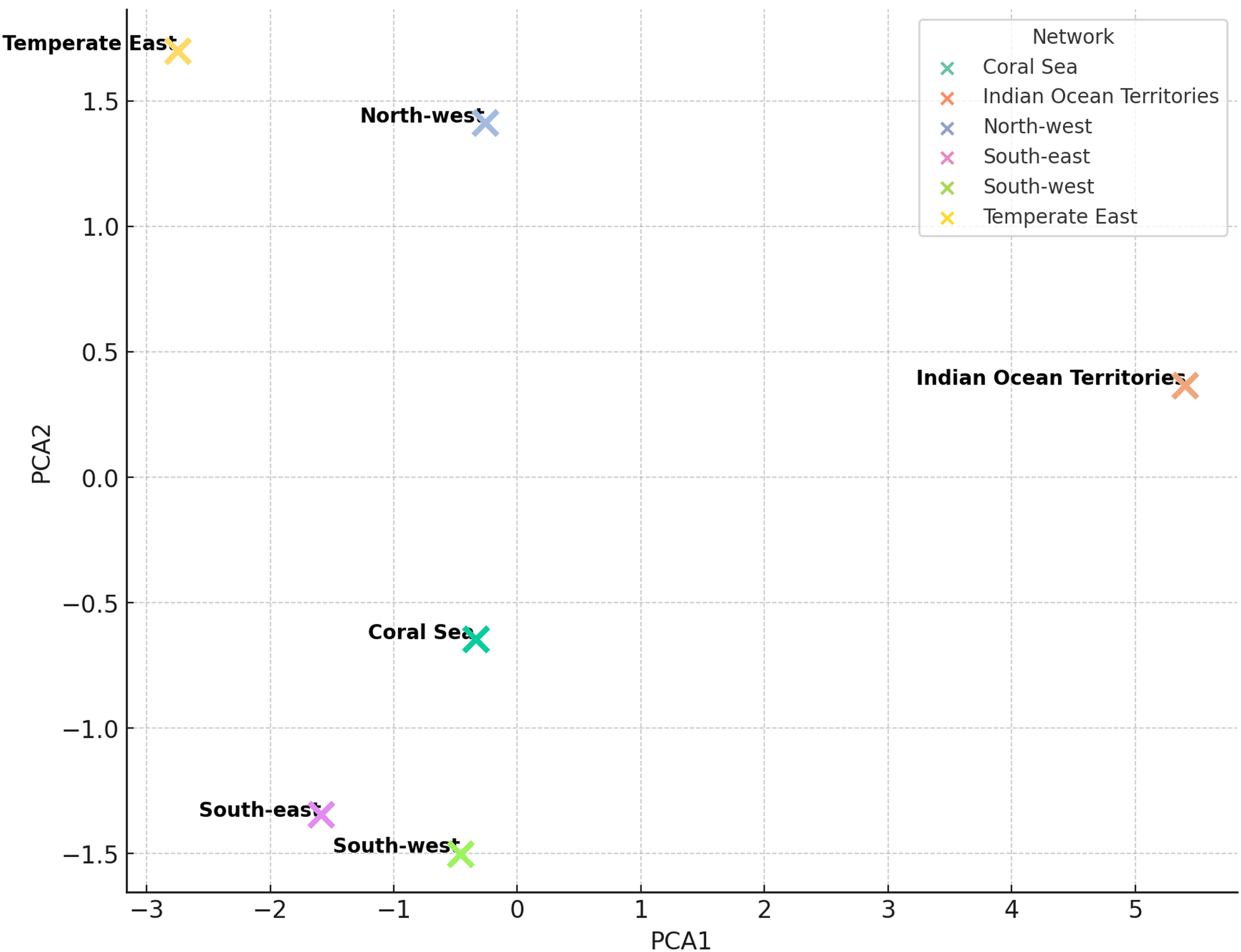 The MDS scatterplot (Figure 4) provides a visual representation of how AMP Networks differ in their geomorphometric characteristics. The South-east and South-west Networks are at similar latitudes and have similar morphological profiles, being comprised of substantially less ‘Plane’ seafloor (45.3 and 42.7% for South-east and South-west Networks, respectively, versus 52.9-75.5% for all other Networks), and a relatively higher occurrence of Ridges (5.9 and 3.4%, versus 0.4-1.5%), Troughs (3.0 and 3.8% versus 1.1-2.5%), and Valleys (6.6 and 8.0% versus 0.5-4.7%). The Indian Ocean Territories Network stands alone, indicating that it has a unique set of morphological characteristics, different from all the other networks.