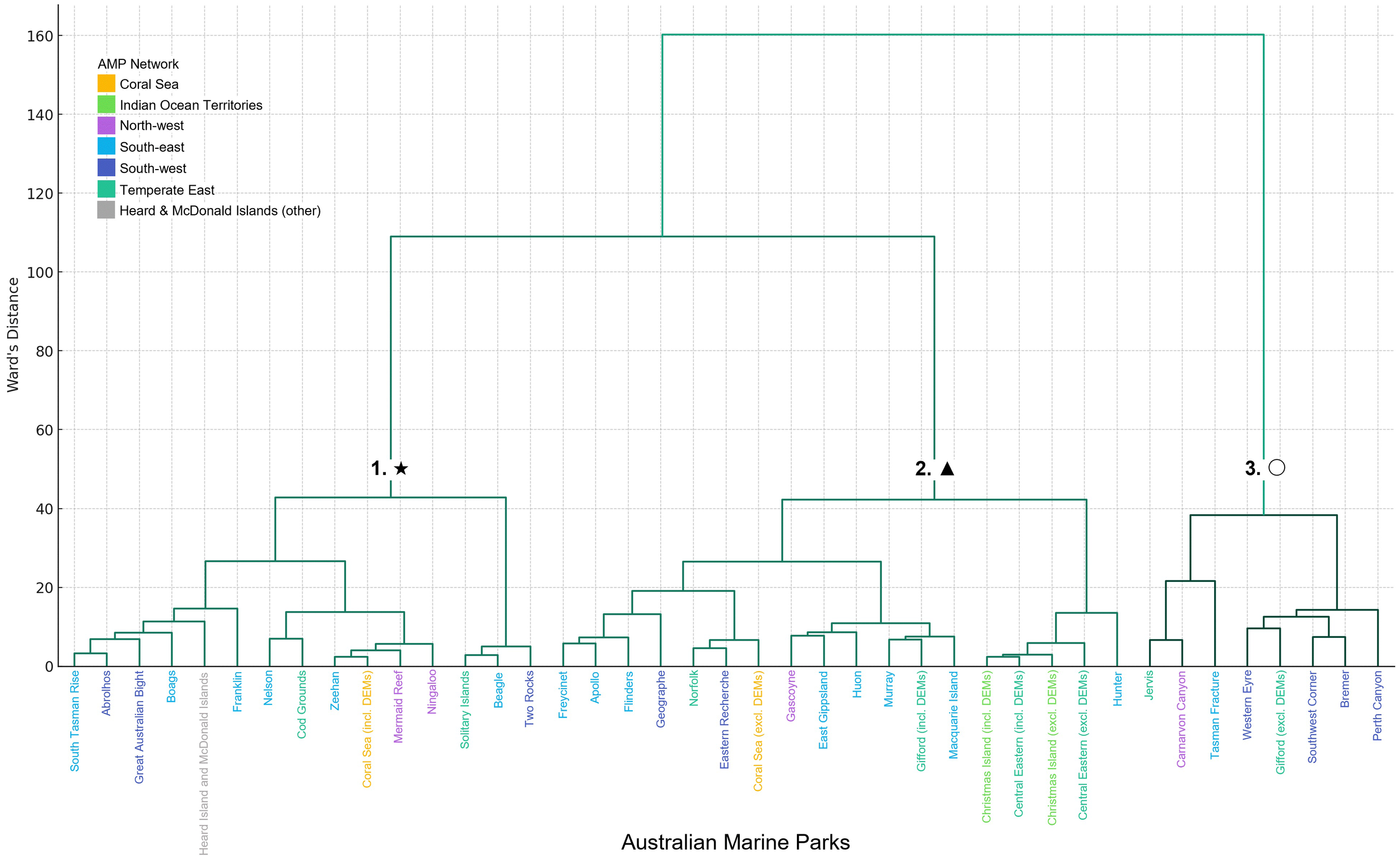 The hierarchical clustering dendrogram showed three primary clusters in AMPs based on their morphological characteristics across all depth zones. Symbols at branch stems indicate the three distinct clusters of AMPs.