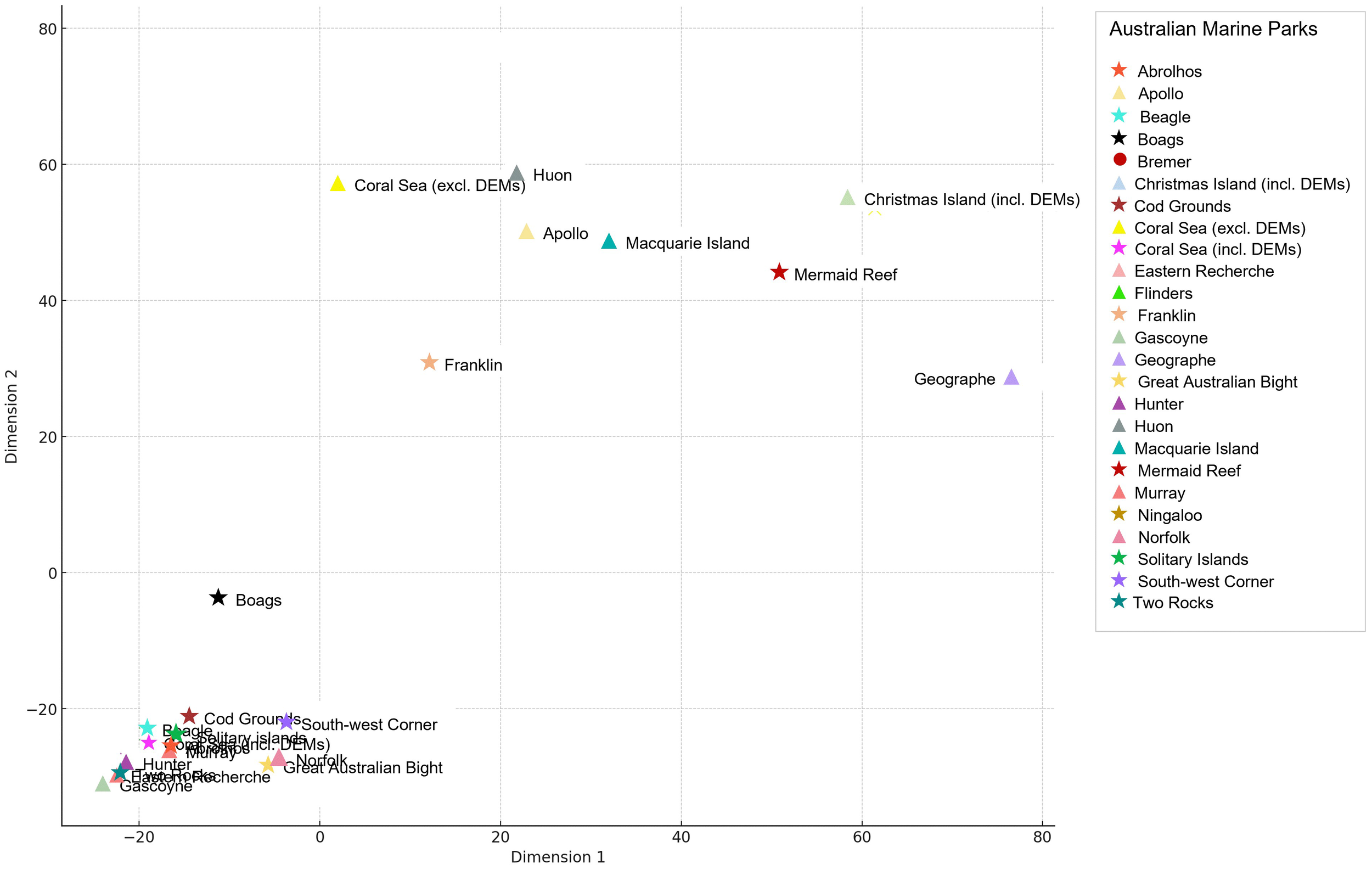 Multidimensional Scaling (MDS) plot illustrating similarities and differences in the seafloor morphological characteristics of Australian Marine Parks.