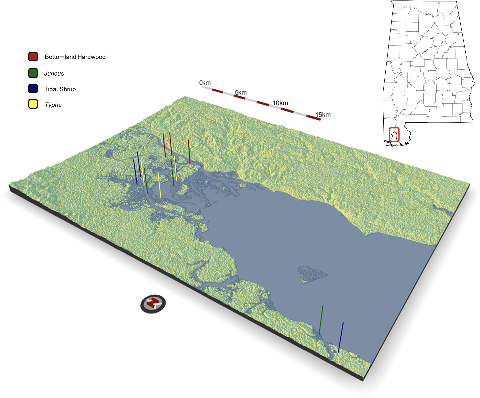 Topographic relief map of the upper Mobile Bay estuary where sediment samples were collected in April, 2021 from n=3 hardwood forest sites, n=3 Juncus sp. sites, n=4 tidal shrub sites, and n=3 Typha sp. sites. All sites were located within a distance <50 km. Map generated using the rayshader package in R.