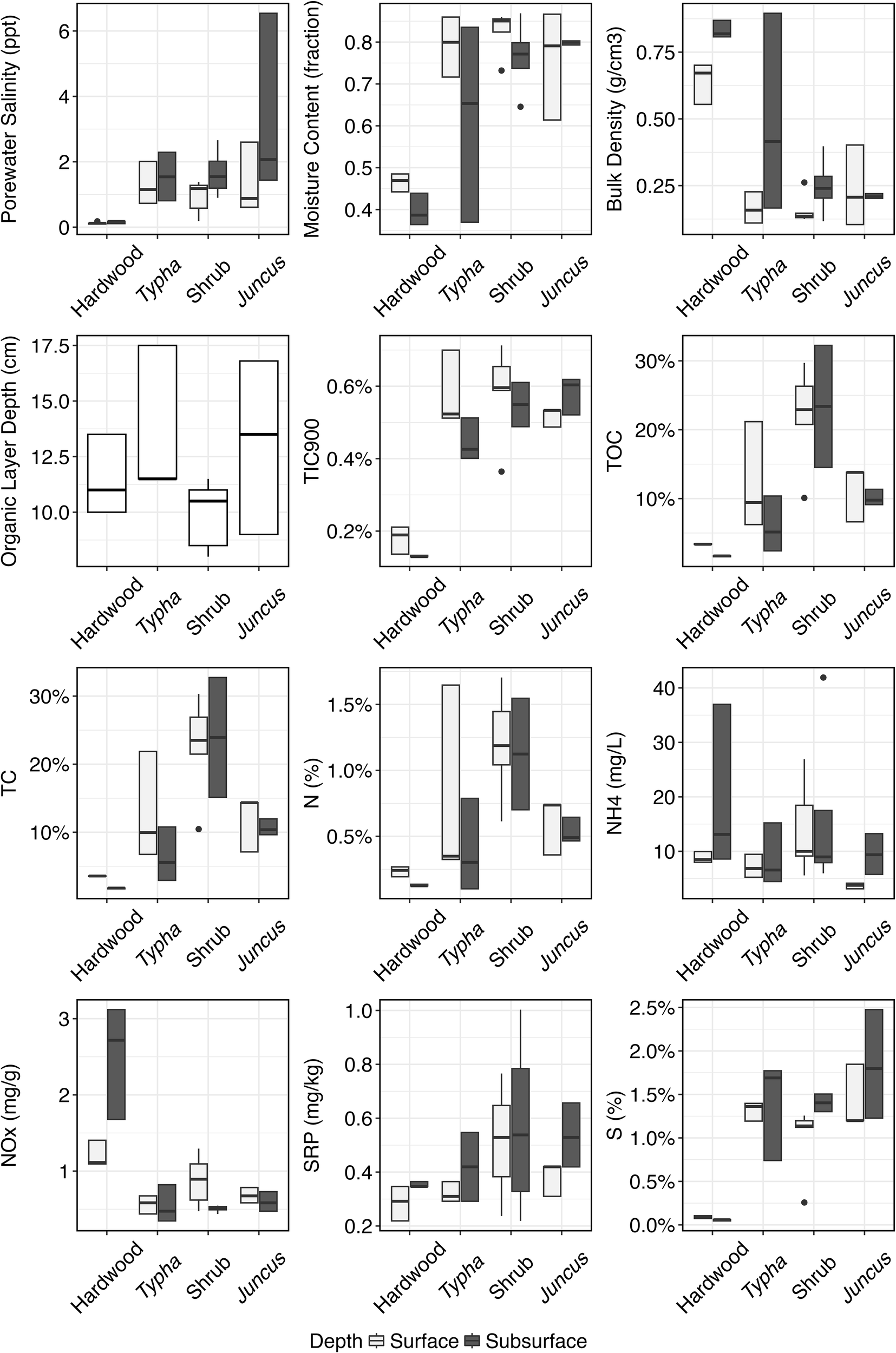 Range, lower quartile, median, and upper quartile of the measured physicochemical parameters in hardwood (n=34), Typha sp. (n=36), tidal shrub (n=47), and Juncus sp.-dominated (n=34) sediment samples. Parameters are plotted separately for the surface, organic soil horizon and the subsurface, mineralized soil horizon.