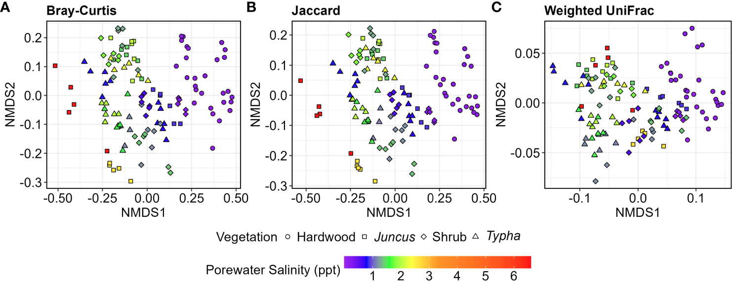 NMDS ordinations of V4 16S sequences collected from hardwood (n=34), Juncus sp. (n=34), tidal shrub (n=47), and Typha sp.-dominated (n=36) sediment samples. (A) Bray-Curtis distance, (B) Jaccard distance, (C) Weighted UniFrac distance of a phylogenetic tree of the 5,000 most abundant ASVs. Porewater salinity ranged 0.0-6.0 ppt and is indicated by color gradient. 2D stress ranged 0.077-0.157.