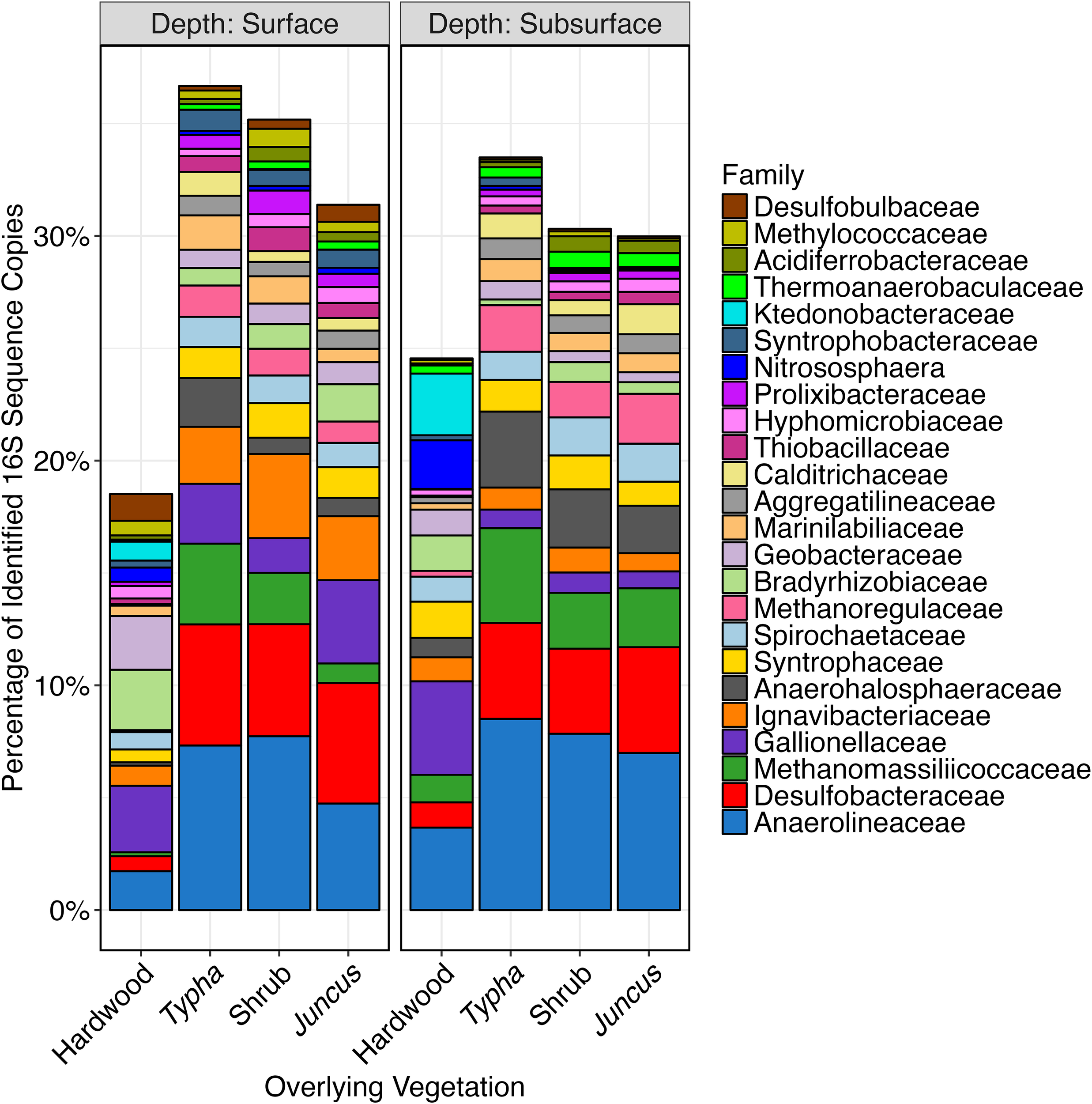 Stacked bar plot of V4 16S sequences which were identified to the family taxonomic level and which collectively comprised >30% of the total sequences generated. Samples are ordered by association with hardwood (n=34), Typha sp. (n=36), tidal shrub (n=47), and Juncus sp. (n=34) and by whether they were collected from the organic soil horizon (n=75) or the mineralized horizon (n=76).