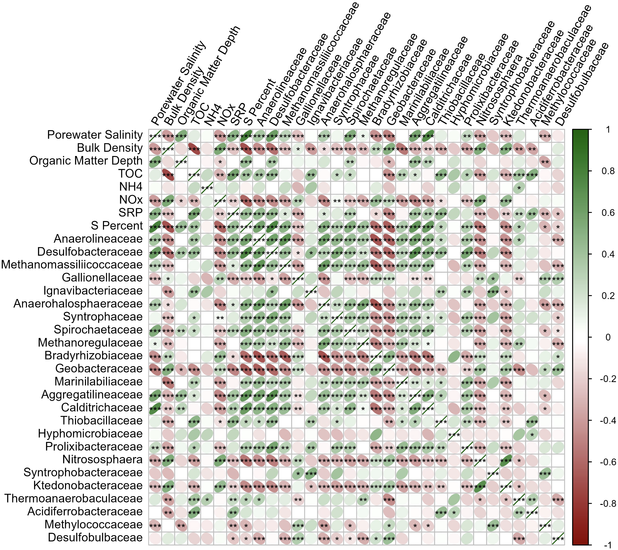 Of the 39.6% of sequences classified to the family level (~5,114,000), 24 families accounted for >30% of the total dataset (Figure 7). Families which varied in abundance by salinity also showed a strong correlation with bulk density and S content, wherein greater sequence abundance at high salinity also correlated with greater sequence abundance at high S content and low bulk density. This community pattern recapitulates the linkages between high salinity, high S content, and low bulk density, which dominate in the frequent tidal inundation of the mid-bay, where more herbaceous vegetation is found (Figure 8). Families which were at significantly greater abundance in more saline porewater included: Anaerolineaceae, Desulfobacteraceae, Methanomassillicoccaceae, Anaerohalosphaeraceae, Spirochaetaceae, Aggregatilineaceae, Calditrichaceae, and Prolixibacteraceae. Families which were more abundant in low salinity porewater were: Gallionellaceae, Bradyrhizobiaceae, Geobacteraceae, Nitrososphaera, Ktedonobacteraceae, and Methylococcaceae.