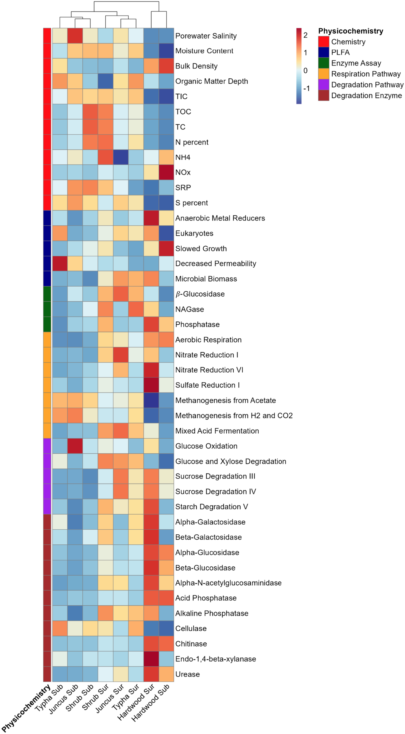 The effect of sediment horizon and vegetation cover on each measured physicochemical parameter, enzyme assay, and PLFA analysis was first assessed with a MANOVA. As these factors were significant (p<0.001) for all variables, individual ANOVAs were performed for each, followed by a Tukey posthoc test to determine pairwise differences. Correlations between the physicochemical conditions were tested using the cor.mtest function in the corrplot package. P-values were adjusted for multiple comparisons using the Benjamini, Hochberg, and Yekutieli method to control for the false discovery rate. Correlations between taxonomic abundance, inferred functional groups, and physicochemistry were determined using the same significance methods.