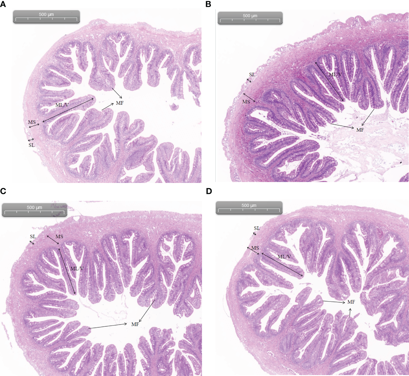 After removing the midgut sample from Bouin’s solution, it was subjected to ethanol gradient dehydration, xylene transparency, and paraffin embedding, and the sample tissue was sliced using a slicing machine to a thickness of 5 μm. Hematoxylin–eosin (HE) staining was used to prepare intestinal tissue sections. The slices were observed under a light microscope, using an imaging microscope or the CaseViewer 2.2 software to capture maps of different typical lesions.